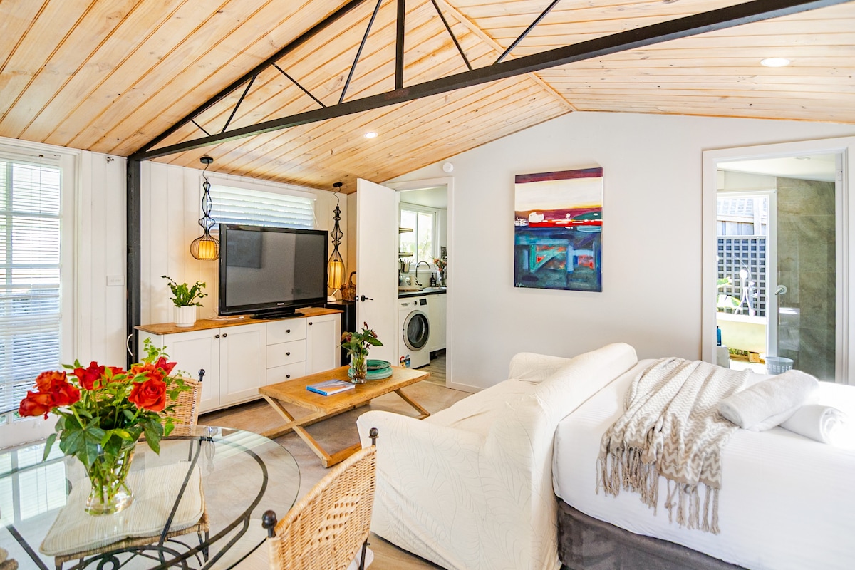 A peaceful rural outlook, sounds of frogs and birds, while lying in a luxurious bath in a stylish, spacious retreat, super comfy queen bed. 2.5km to Whites beach. Note: The studio is attached to our house, you may hear general life kitchen/tv noise, but you have a private entrance and secluded easterly deck. BBQ, & kitchenette with microwave, air fryer, rice cooker, kettle, toaster. Dog friendly. PLEASE - dog bath before arrival, bring a towel for muddy/sandy paws.