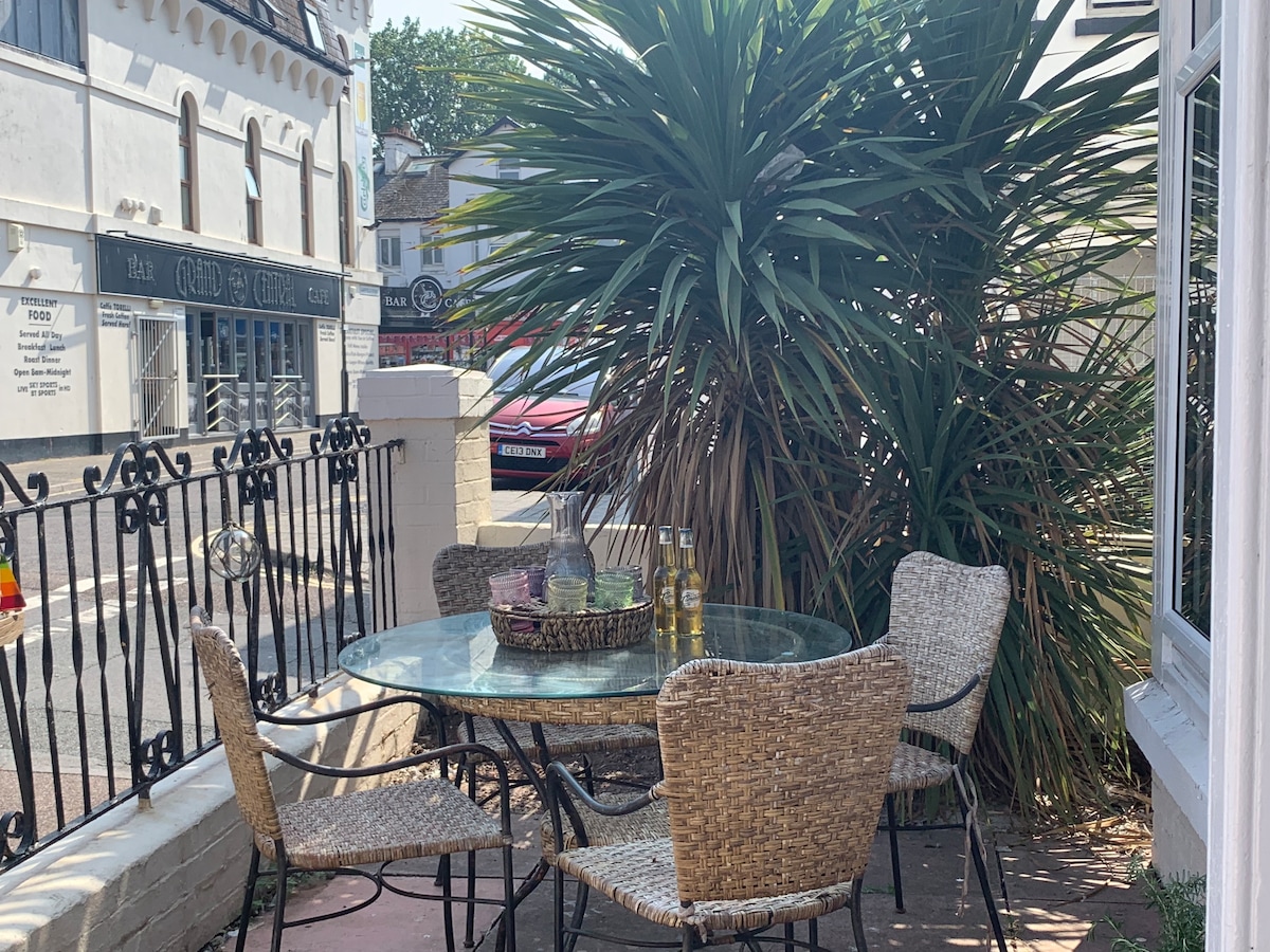 Stunning 1 bedroom apartment just off Torquay seafront, 5 mins walk to the beach & 15 to marina & town centre. Close to the train station & bus stops. Kitchen/Diner/Lounge, It's well equipped & decorated to a very high standard. Private walled outside space, with raised pond & waterfall. Dedicated parking space with EV charger (£0.465/KWH Max charge) . 3 nights min stay 3-5 night min peak season. This is a quiet residential area and thus suitable only for those with a quiet stay in mind