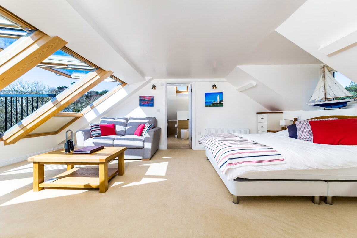 Sea view is just off the seafront in Torquay, 5 mins walk to the beach & 15 to the marina. Spacious 1st floor en suite bedroom with lovely sea views & sumptuous attic bedroom with a beautiful en suite & Velux balcony overlooking the sea. Private parking with EV point. We accept 3 nights min & 3-5 nights min/ peak season & school hols. * Sea View is located in a quiet residential area of Torquay and is therefore only suitable for those with a quiet relaxing time in mind*