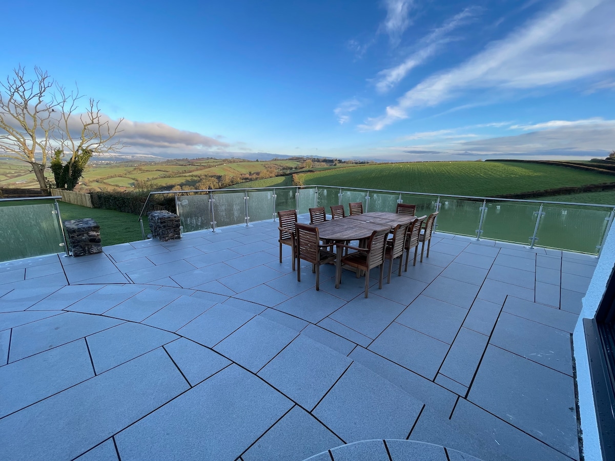 Stylish fun home, views, hot tub, fire, big garden