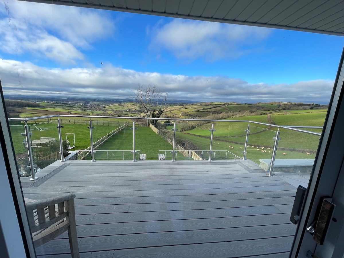 Newly built, high quality, modern, open plan three bedroom accommodation outside Exeter, sleeping 5. Large, modern kitchen with dining and living room overlooking the stunning Devon countryside, River Exe and sea beyond. There are 2 bathrooms, one with a large, double shower. On a beautiful day sit and relax with a glass or two on the covered balcony and watch the stunning wildlife (deer, pheasants, buzzards, hawks, woodpeckers...) Close to Exeter, Dartmoor and local beaches. Private garden.
