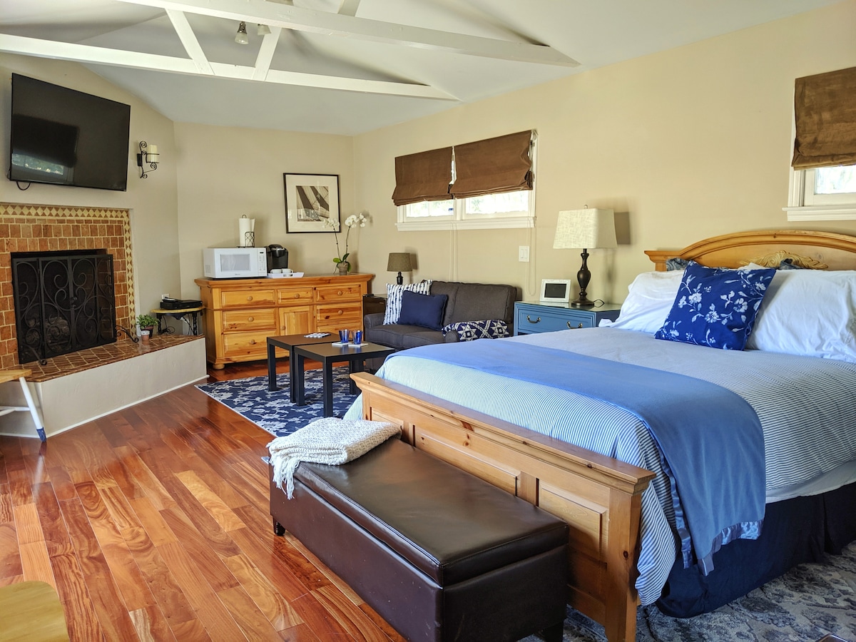 This is a comfy little studio attached to the main front property. You would have complete privacy with a private entrance and self-check in. The studio has a standard queen size bed (60x80in), bathroom, closet space, small dining table & a desk/office space. There is not a full kitchen, but the room has a mini fridge, microwave & k-cap machine. -Good for business travelers & solo adventurers -Free parking available on the premises