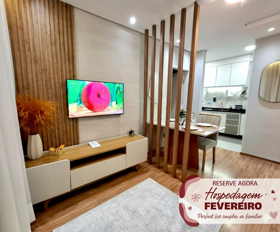 Alto padrão! Excelente localização! Completo: Wi-Fi, ar-cond, blackout, cozinha equipada (frigobar gde, cooktop, purificador de água, omeleteira, cafeteira, sanduicheira, microondas, etc); espaço p/ trabalho, roupa cama/banho, vaporizador p/ roupas, depósito, berço/cercado. Estacionamento 1 veículo (cabe cabine dupla). Acomoda 4 pessoas: 1 cama de casal; 1 sofá cama. Iluminado e arejado! Piscina, lavanderia c/ secadora, academia, sauna, espaço co-working, churrasqueira. Portaria presencial 24hs!
