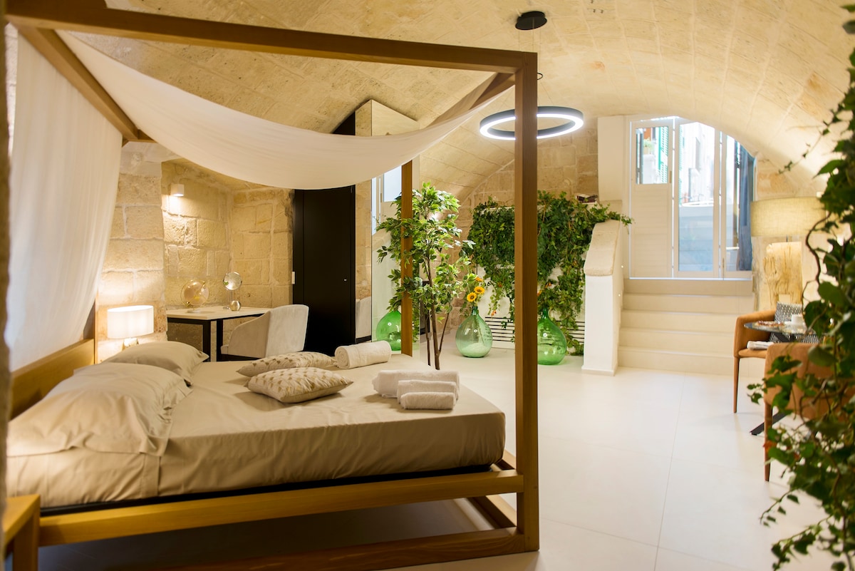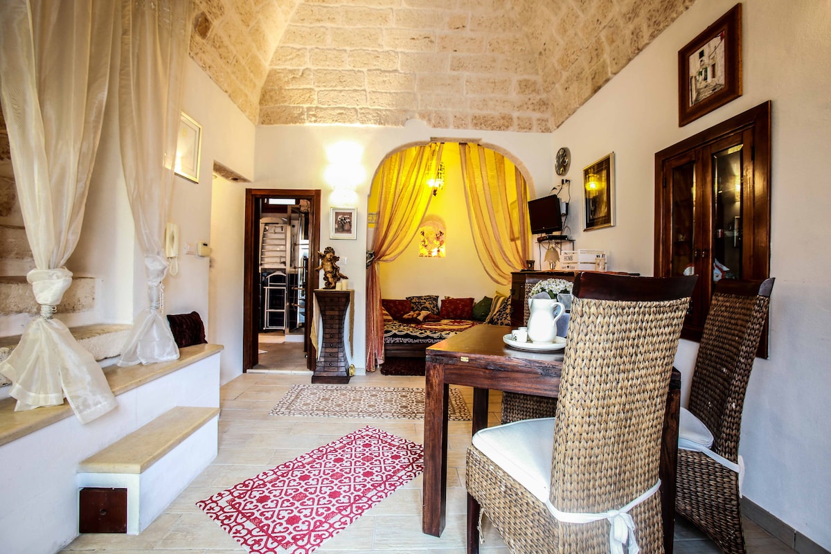 CIS: BR07401291000000188 CIN: IT074012B400033730 Vivi la magica sensazione di trovarti tra passato e presente: è una dimora storica! I pavimenti d'epoca e le pareti in pietra fanno da sfondo a un ambiente arredato con oggetti di design, vecchie ceramiche e mobili locali. L'ampio terrazzo privato, con solarium e doccia calda, saprà entusiasmarti: potrai rilassarti con un bicchiere di vino al tramonto, godere del sole su comodi lettini o preparare una cena in una magica atmosfera pugliese.