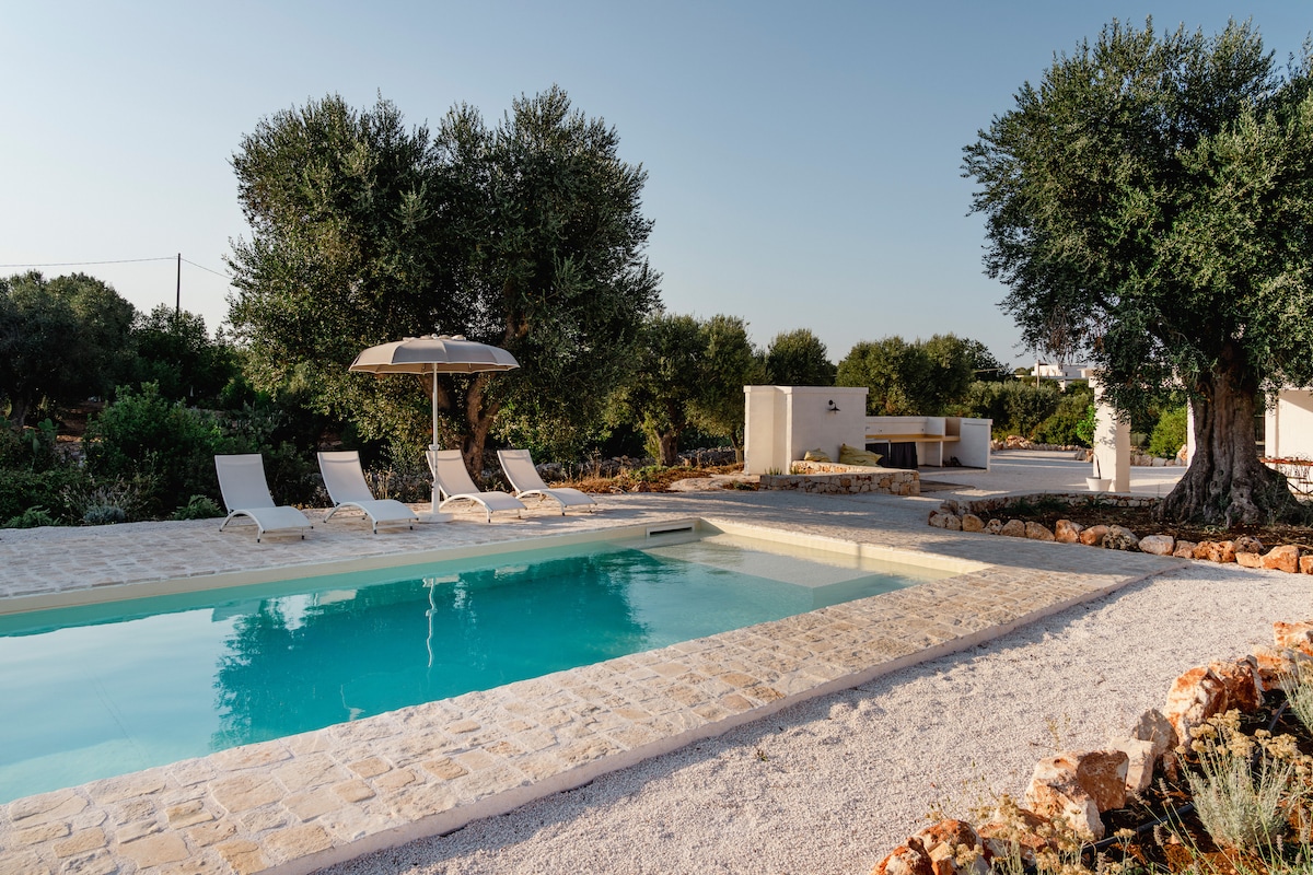 The Trullo Apulia is an exclusive property, made by recovering an original ancient historic domed house (called "Trullo Saraceno"), enriched by swimming pool, Jacuzzi and steam room for private use, in a scenic location, just 2 km from Ostuni and 10 km from the beautiful beaches of Puglia. It can accommodate up to 8 people. Note: the reservation fee does not include consumptions of electricity (0.50€/kWh), gas (5€/m3) and the tourist tax (1€/day for each person for the first 5 days) that will be calculated and paid at the end of your stay. Struttura esclusiva con piscina, idromassaggio, bagno turco, 8 posti letto, posizione panoramica, a 2 km da Ostuni e 10 km dal mare. Nota: i costi di consumi elettrici, gas e tassa di soggiorno non sono inclusi nella fee di affitto e dovranno essere calcolati e pagati alla fine del soggiorno. Italian Version Il Trullo Saraceno Apulia è una struttura esclusiva con piscina ad uso privato, in posizione collinare panoramica, a soli 2 km da Ostuni e 10 km dalle splendide spiagge pugliesi. Dispone di 2/3 Camere da letto matrimoniali, 4 bagni (di cui uno con bagno turco, vasca idromassaggio e doccia emozionale), 2 zone living (con 2 divani letto matrimoniali), 2 cucine, 2 camini e può comodamente ospitare fino a 8 posti letto. Atmosfera unica che unisce l’inconfondibile stile mediterraneo ai comfort più moderni, per un soggiorno esclusivo ed originale, all’insegna di relax, privacy e benessere naturale. La struttura è costituita da 2 unità abitative (trullo saraceno con 3 coni + lamia) totalmente indipendenti, ma comunicanti tra loro, separate da una porta con serratura. Ciascuna unità comprende una sala da pranzo con camino, TV a led satellitare e divano-letto matrimoniale, un cucinino completo di elettrodomestici (frigo-freezer, forno elettrico, lavastoviglie, lavatrice, piccoli elettrodomestici)e una camera da letto con bagno privato, completo di doccia emozionale per cromoterapia. Ideale per 2 famiglie di amici che, fatta salva la privacy, possono godere di momenti comuni di relax e divertimento, può anche essere utilizzata come unica unità abitativa, utilizzando una delle due zone living come terza camera da letto matrimoniale. Tutti gli ambienti della casa sono climatizzati e dispongono di connessione internet WiFi. Gli ospiti hanno a disposizione un parcheggio privato. L’intera struttura ha una capacità ricettiva massima di 8 posti letto, mettendo a disposizione dei suoi ospiti ben 4 bagni, di cui 2 interni completi, un’area benessere con bagno turco, aromaterapia, ampia vasca idromassaggio (che si affaccia su una suggestiva parete rocciosa), doccia emozionale con cromoterapia e servizi igienici ed 1 bagno esterno (water+lavandino) con doccia. L’esclusiva piscina a sfioro di acqua salata con idromassaggio è immersa nel verde della macchia mediterranea. Questa oasi di privacy e di relax dispone di tutto il necessario, inclusa una Zona solarium, la doccia esterna ed il bagno di pertinenza. La profondità dell’acqua della piscina risponde ai requisiti di legge per garantire la massima sicurezza anche dei più piccoli. Molteplici sono gli spazi esterni arredati e le ambientazioni minimal chic che consentono agli ospiti di pranzare o cenare su un ampia terrazza panoramica ombreggiata da un gazebo cannucciato o di gustare, appena svegli, una ricca prima colazione all’aperto, in un’area attrezzata proprio davanti alla portafinestra della propria camera da letto, respirando i profumi dei campi, nell’intimità della luce del primo mattino. Al tramonto, l’unicità del trullo e del giardino circostante, vengono ancor più esaltati dall’illuminazione serale, che vi regalerà nuove emozioni ed un fascino indimenticabile, rallegrati dai sapori inconfondibili dei cibi grigliati al barbecue. Il complesso abitativo è frutto di una recentissima ristrutturazione di costruzioni dal valore storico (il Trullo Saraceno dalla caratteristica cupola bianca è ancora più antico del trullo a cono), in cui il sapiente recupero dei materiali, delle tecniche e dei canoni tipici dell’architettura e della storia pugliese, hanno consentito un restauro di interni ed esterni che mantenesse una linea fortemente evocativa e rispettosa dei luoghi, anche nell’arredamento dai colori chiari e naturali, studiati con la massima attenzione ai dettagli e costituito da pezzi unici e originali. Il fascino della location non conosce paragoni: la costruzione si affaccia su un giardino terrazzato caratterizzato dai tipici muretti a secco, oltre i quali si apre, a perdita d’occhio, su un’area di circa 6.000 mq di pertinenza esclusiva della casa, una valle di magnifici ulivi secolari su terra rossa. Un agrumeto, un frutteto, ampie aree di macchia mediterranea tra le quali trovano spazio molte piante ed erbe aromatiche, dischiudono immagini, in un tripudio di colori e profumi di natura incontaminata che illuminano gli occhi ed allietano la mente. l frutti e gli ortaggi tipici pugliesi, totalmente biologici, sono a disposizione degli ospiti. NOTA: Trullo Apulia promuove un uso sostenibile dell'energia elettrica e dell'acqua (presenti pannelli fotovoltaici e per riscaldare l'acqua sanitaria) e ci piacerebbe che anche i nostri ospiti facessero lo stesso. Per questo motivo non includiamo i consumi elettrici in maniera forfettaria nelle spese di affitto ma saranno conteggiati secondo il consumo effettivo che verificheremo insieme, confidando in un vostro uso responsabile (per il dettaglio, vedi la sezione "Altre cose da considerare"). English Version The Trullo Saraceno Apulia is an exclusive property with swimming pool for private use, in a scenic hillside location, just 2 km from Ostuni and 10 km from the beautiful beaches of Puglia. It has 2/3 Double bedrooms, 4 bathrooms (one with a steam room, whirlpool bath and emotional shower), 2 living areas (with 2 sofas bed for 4 people), 2 kitchens, 2 fireplaces. The whole structure can comfortably accommodate up to 8
