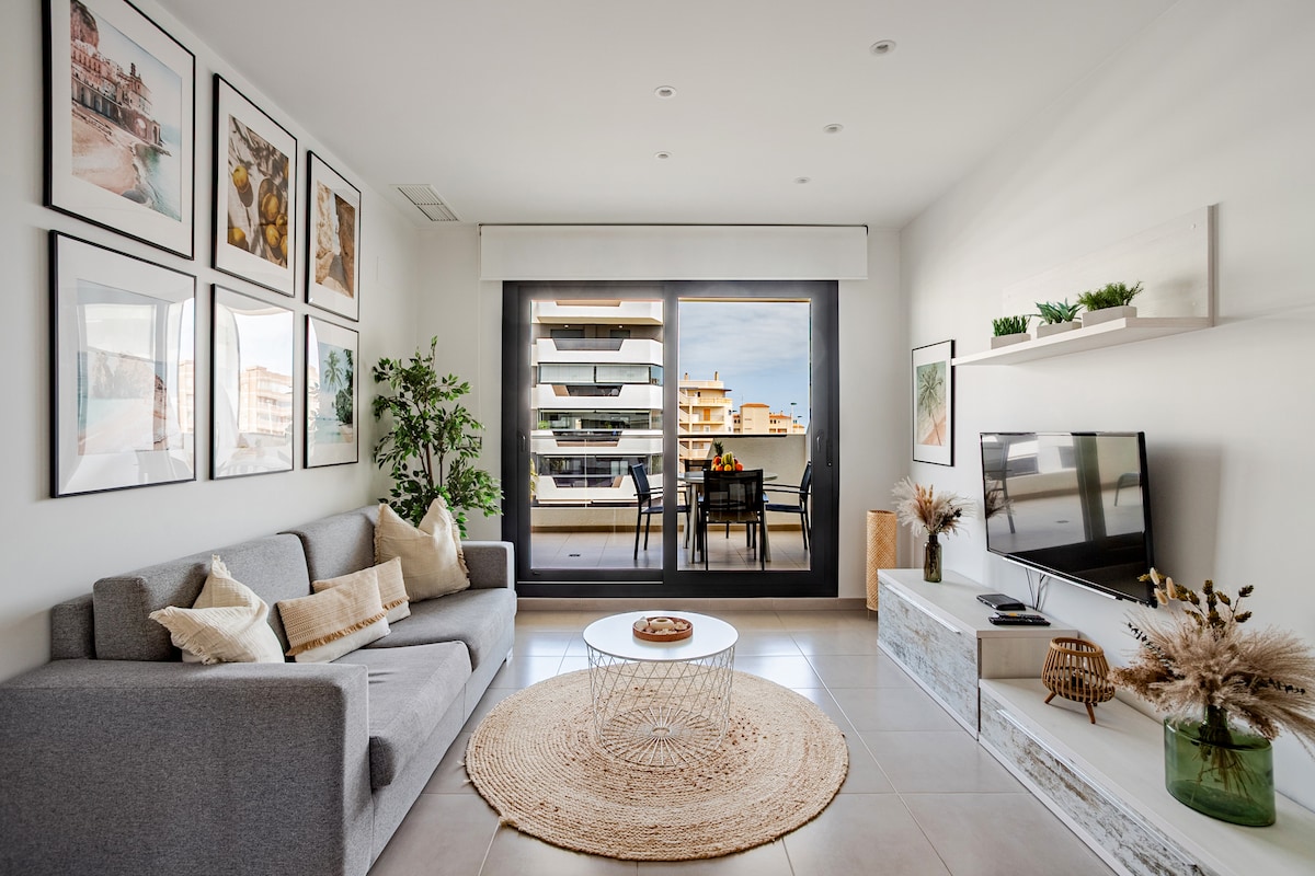 A lovely flat, ready to enter, in a calm condominium with pool and only 5 minutes away from the beach. Nearby you will find all services you might need. Ideal for families with children since it is equipped with cradle, high chair and playground.