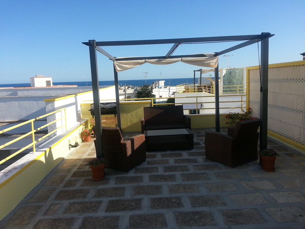 You'll feel in heaven on the sofas of the terrace in the historic center. Blue everywhere: the sky and the sea blend together. The silence broken only by the seagulls' voices. Sunset aperitifs and nights full of stars will be unforgettable. The ideal home for those who are searching for quiet and peace: cozy, clean and familiar, with stylish and exclusive design. From the typical courtyard of the historic center, two flights of stairs will take you to the attic. Recently renovated and furnished with care for the smallest details, it' s ready to welcome you for a dream holiday. It has a lounge, well-equipped kitchen with dishwasher, 1 bedroom with fireplace, 1 bedroom with TV and desk, 1 bathroom and 2 gorgeous terraces for exclusive use. PLUS 1: EXTREMELY RARE TERRACE AT THE SAME LEVEL OF THE APARTMENT: equipped with outdoor kitchen, dining table in the shade of bamboo pergola and large outdoor shower made of Salento’ s typical tiles. So you can, through the large window of the living room, cook, have lunch, relax or have a refreshing shower directly on the terrace. PLUS 2: EXCLUSIVE UPPER TERRACE: a staircase of a few steps will lead you to the large terrace overlooking the sea of the beach of Purità: equipped with built-in sofas, spacious bamboo pergola to shelter from the sun, colored deckchairs and a large table to have dinner under the stars • The house and the terraces are your complete and exclusive arrangement! • The apartment is suitable for adults friends and families with children. • We have powerful AC WI-FI, free for our guests. • Dishwasher and washing machine are available A trusted person will give you the keys on your arrival. For any need you can contact us by phone or mail or whats App. insta gram @mactoia This peaceful home sits in the historic seaside town of Gallipoli. Walk to supermarkets, pastry shops, great restaurants, trendy clubs, and the marina and beautiful beach. CHILDREN: In the presence of children, the large upper terrace requires the presence and supervision of an adult. STAIR: To reach the apartment there are two flights of stairs to do. Also from the first terrace there are a dozen steps to go up to the upper terrace. PARKING: It is not allowed to enter the old town of Gallipoli by car: you can park your car in the parking lot of the marina and continue on foot: the house is about 200 meters away.