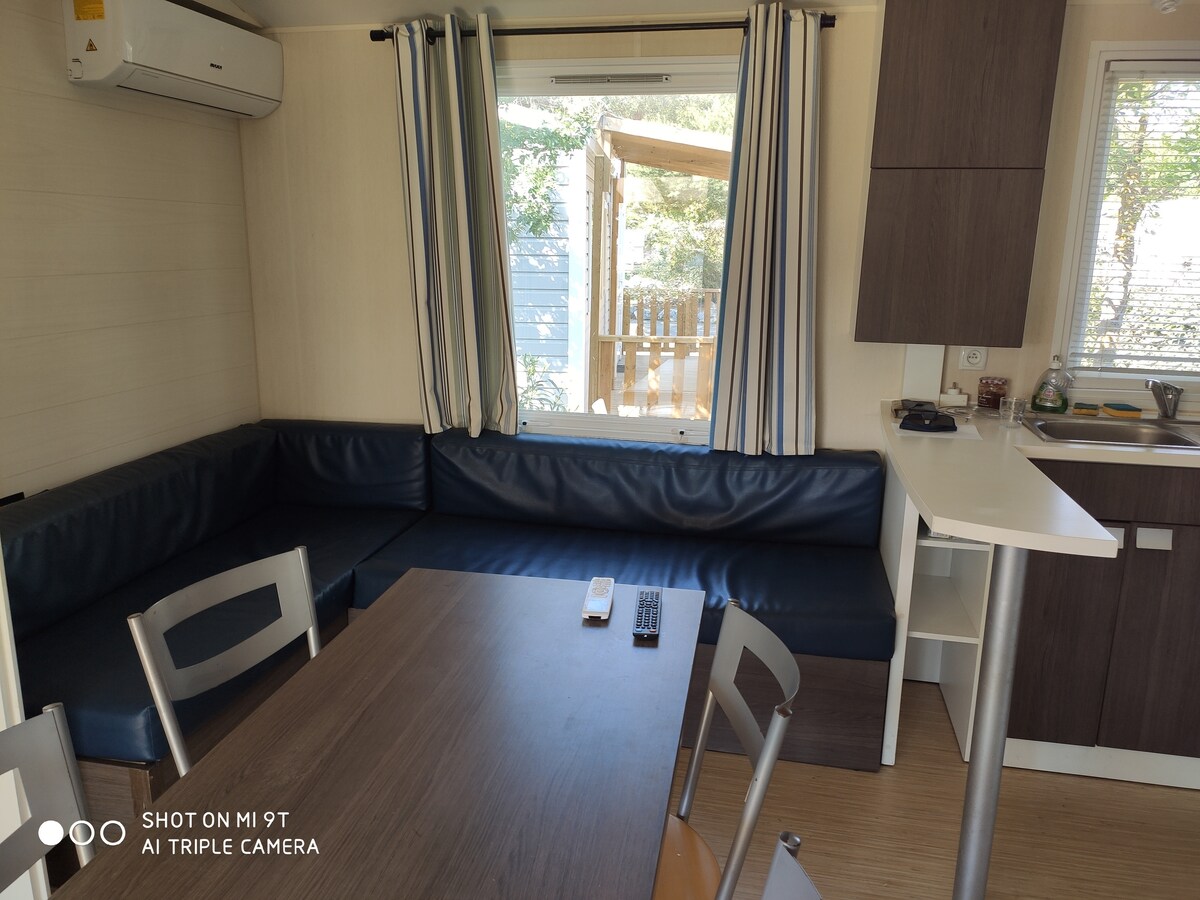 MOBILHOME 6 places 40 m² avec climatisation réversible, grande terrasse extérieure clôturée avec 1 portillon sécurisé , salon de jardin, 2 transats. Vaste salon avec télé orientable, 1 canapé convertible 2 places, 2 grandes chambres dont 1 parentale, literie haut de gamme avec grand dressing et TV Cuisine équipée, vaisselle, four, micro-ondes, plaque de cuisson, frigo avec congélateur , grille pain, bouilloire, cafetière filtres et TASSIMO dosettes, lave-vaisselle, machine à laver et étendage.