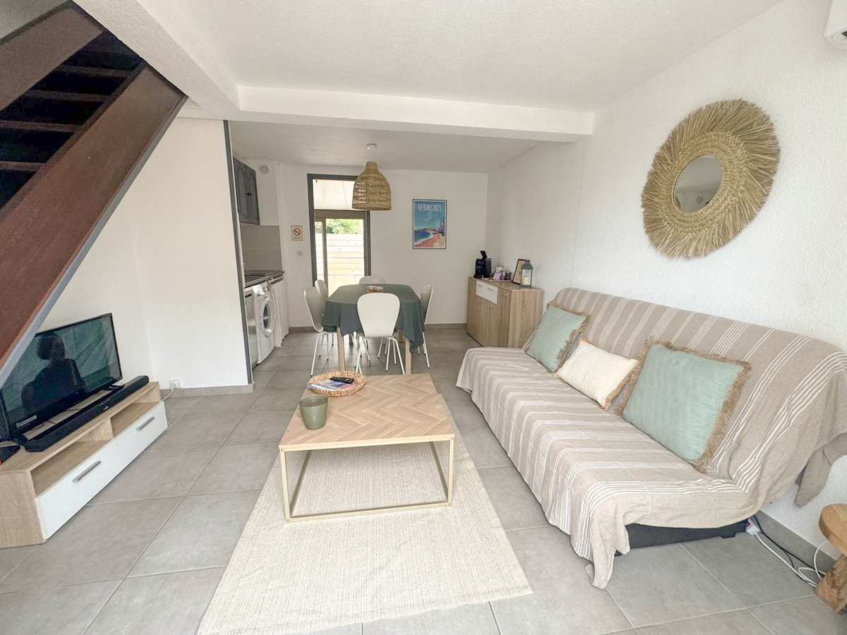 Petite maison de 28m2située à 200m de la mer, dans le 66 et non en Camargue résidence sécurisée avec climatisation, une place de parking privé, Le logement dispose d'une chambre séparée ainsi que d'une mezzanine avec un canapé lit La terrasse privative vous permettra de vous ressourcer au soleil A coté de l'Espagne(45min) Collioure(30min) Perpignan(15min) Le logement vient d'être entièrement refait à neuf afin de pouvoir vous accueillir dans les meilleurs conditions Les animaux sous réserve