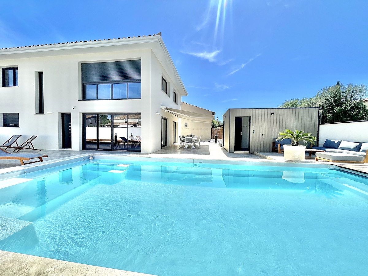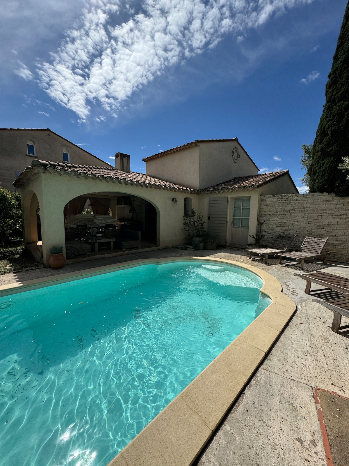 Villa de vacances avec piscine extérieure privée Détente assurée avec une pergola et une cuisine d’été (barbecue plancha) La maison dispose de 3 chambres ( 2 lits en 160 cm et un canapé transformable),2 salles de bains,2 toilettes,une cuisine ,une salle de sport et un séjour de 40 m2 À l’arrivée vos lits seront faits et le linge de toilette est fourni gratuitement Nous acceptons les animaux de compagnie