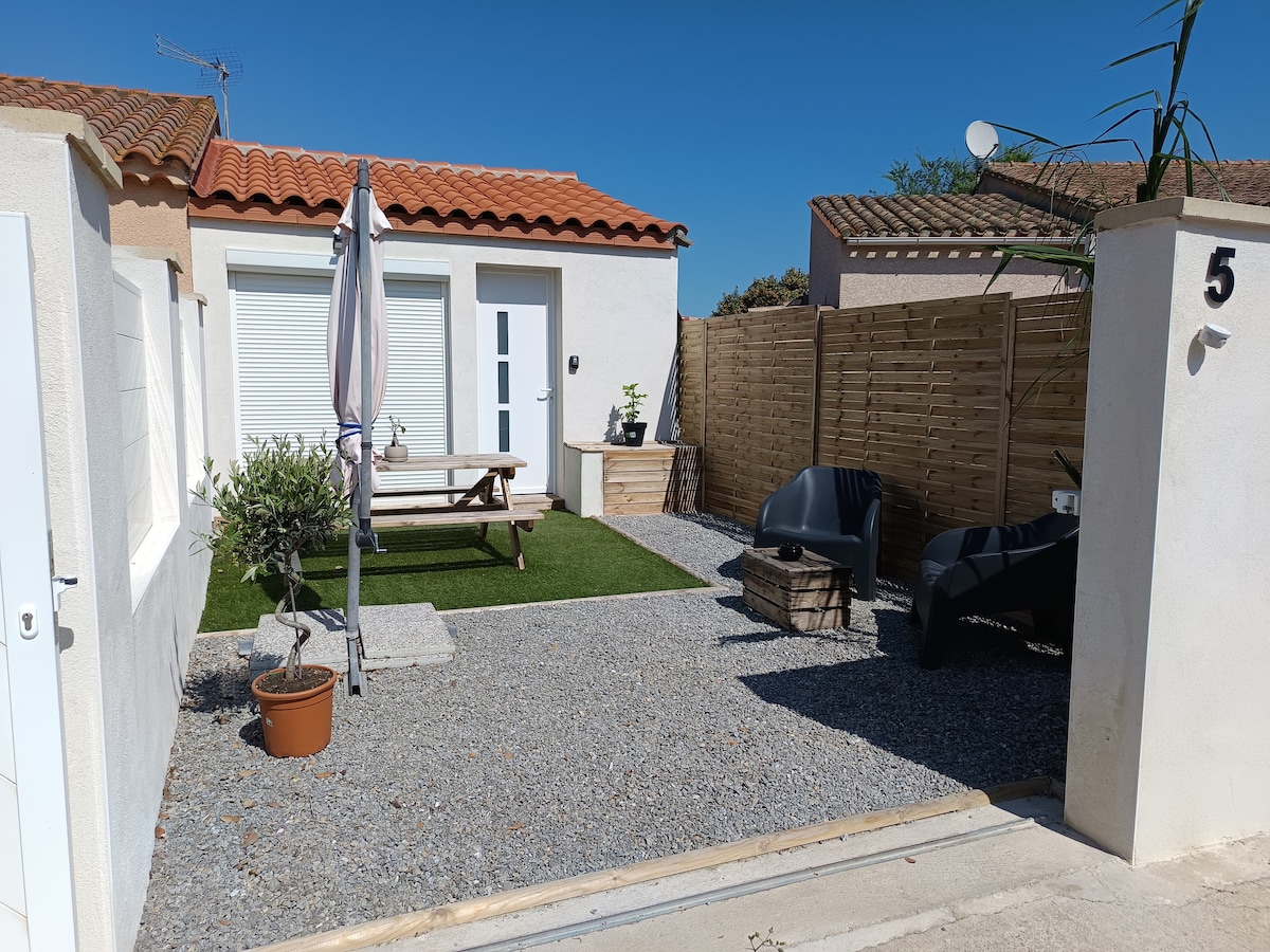 Un très beau logement neuf climatisé dans un esprit cocooning, situé au calme secteur résidentiel sur une jolie propriété. Un T2 lumineux , cuisine et salon ,une chambre et une salle d’eau séparée . Logement indépendant avec un extérieur (terrasse et côté jardin), prêt à vous accueillir. Situé à Torreilles village , à 5 minutes de toutes commodités tant pour le centre du village que pour les extérieurs commerces et 5 kms de la plage et à 10 km Perpignan Piste cyclable du logement à la mer