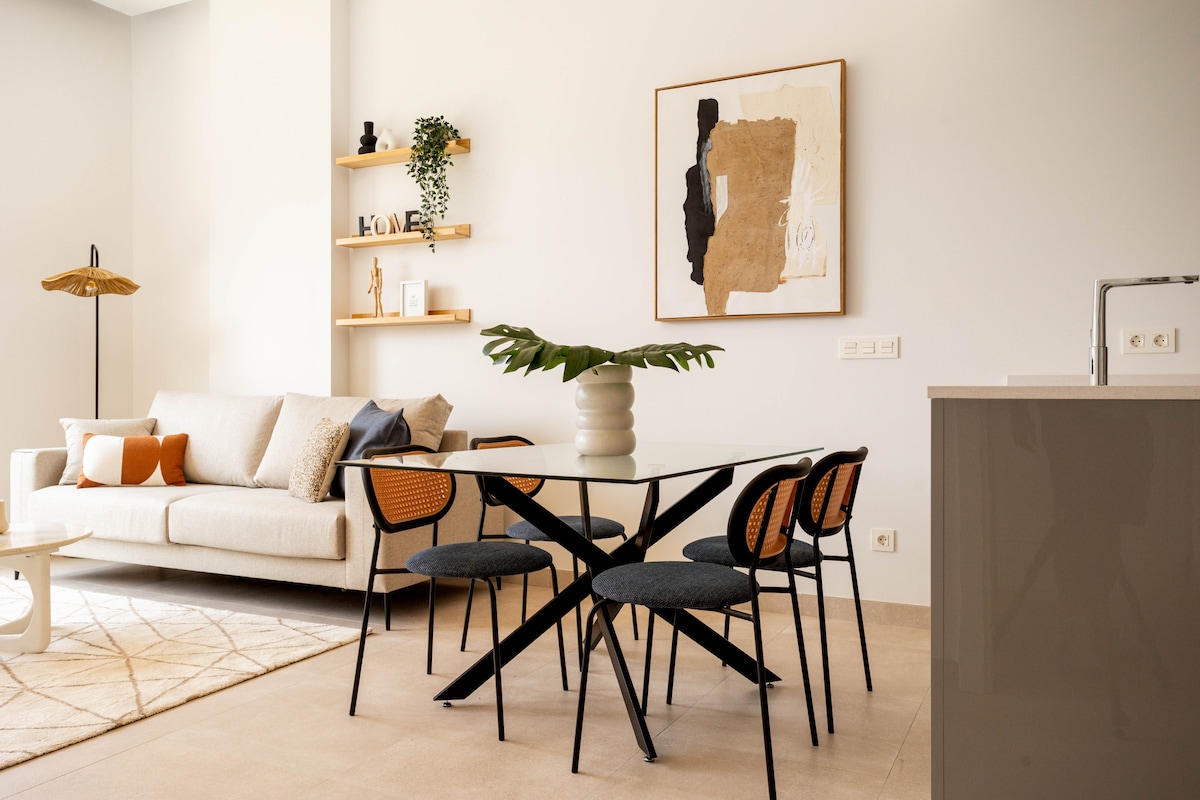 Bonito y luminoso apartamento resultado de una reforma integra de una modesta vivienda. Finalizada la reforma en octubre de 2021. Apartamento concebido y diseñado exclusivamente para el uso turístico. El apartamento tiene 2 dormitorios con cama de matrimonio, salón comedor, cocina totalmente equipada dos baños y patio privado. Situado a 5 minutos andando del casco histórico y de la estación de tren. Importante: Por favor antes de hacer la reserva leer las normas de la casa.