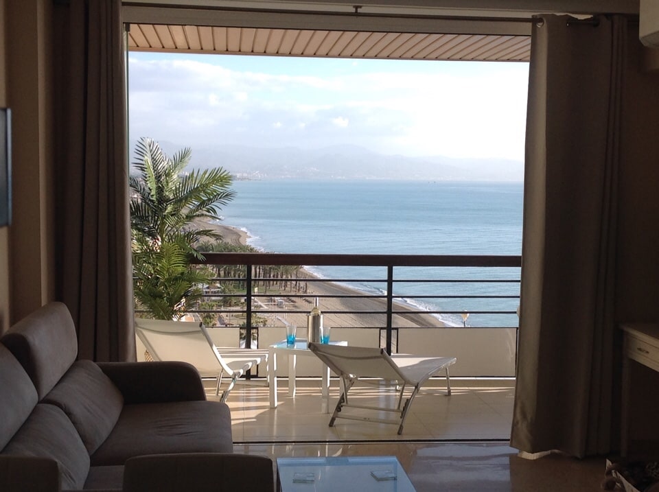 Estudio con terraza y vistas al mar frente a la playa. Cuenta con aire acondicionado, smart tv, netflix y punto de lectura. El complejo Benalbeach alberga gimnasio de pago, mini parque acuático con toboganes en las piscinas, supermercado, sala de juegos y snack bar disponible durante el verano. Durante el invierno se modifican las aperturas de las piscinas, pero jardines disponibles todo el año. - Prohibido fumar. - Mascotas no permitidas.
