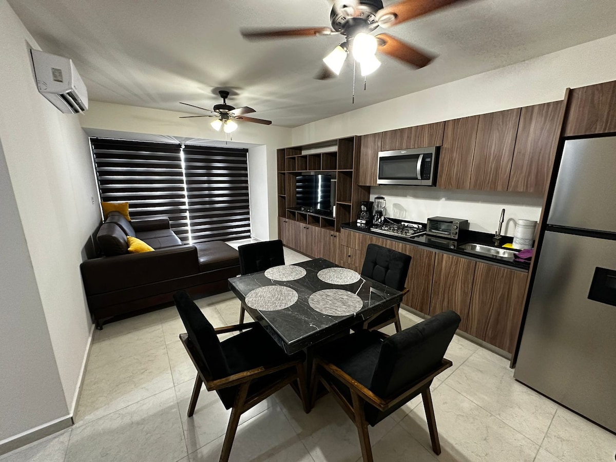 Sumérgete en la comodidad de nuestro exclusivo departamento de 1 recámara y 1 baño. Ideal para 2 adultos y 2 menores de 12 años o en su caso 3 Adultos. Cama tamaño Queen , Wifi y 2 televisores. Un Sofá bastante amplio para usarse como Segunda Cama extra. Cocina equipada con todos sus utensilios y electrodomésticos. Centro de lavado. 2 mini split. 1 cajón de estacionamiento. En las áreas comunes acceso a alberca, área de coworking, mesa de billar, gimnasio. Además puedes jugar pádel y divertir