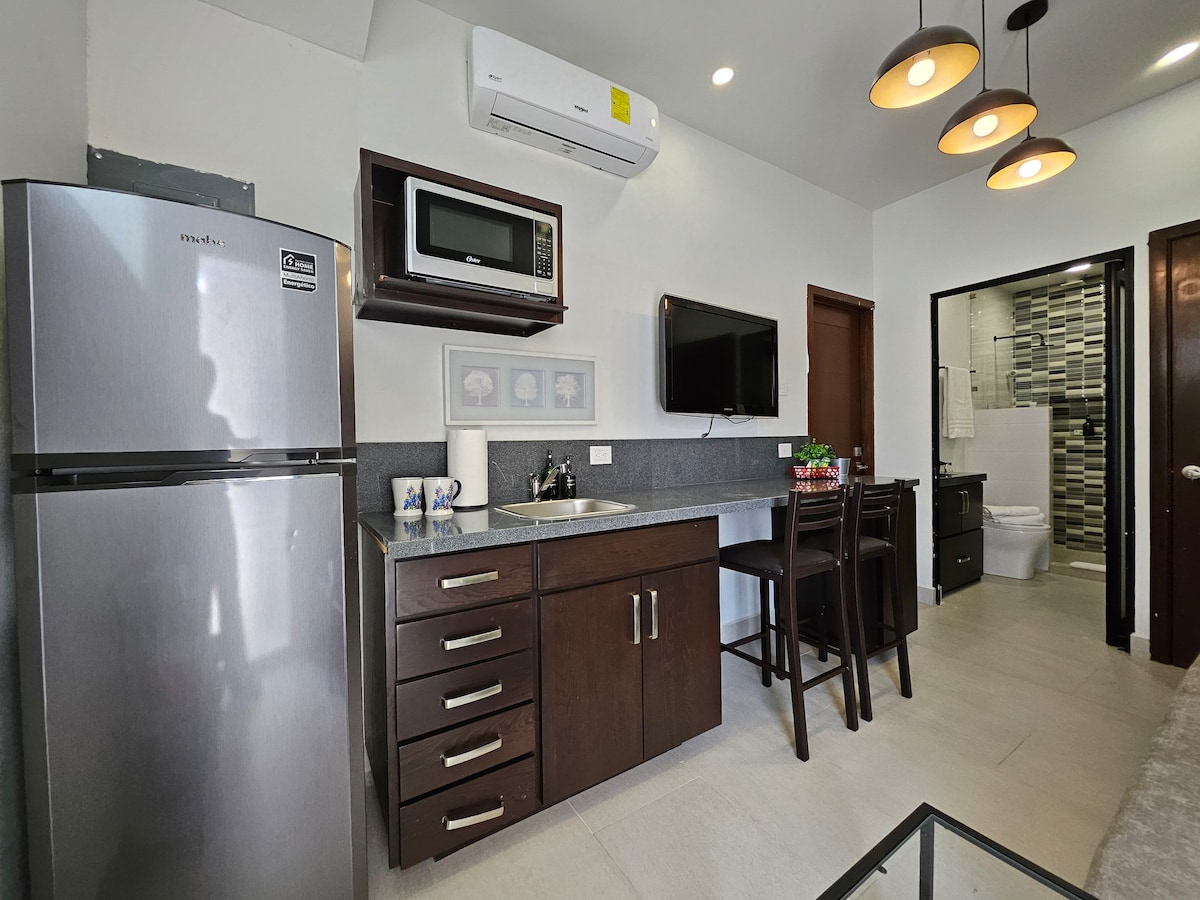 Spacious private suite with independent entrance, perfect for business trips or long-term stays. Located in a secure, gated community near shopping malls, grocery stores (HEB, Costco), Tec Milenio & Ibero universities, restaurants, and venues like Coliseo Centenario, Estadio Corona, and the Convention Center within minutes. Fully equipped kitchenette, fast WiFi, A/C, and coffee station. Safe and quiet area, well connected. No smoking or pets allowed.