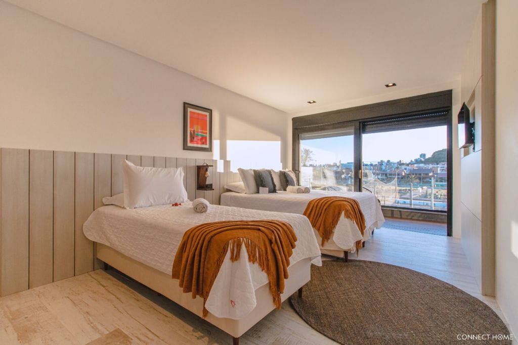 O quarto oferece uma vista para o morro do farol e a lateral do mar. Comporta até quatro pessoas, dispondo de uma cama queen, uma cama de solteiro e a possibilidade de uma cama auxiliar baixa. Equipado com ar condicionado quente/frio, frigobar, ducha de teto aquecida a gás, smart TV, Wi-Fi, sacada e banheiro privativo.