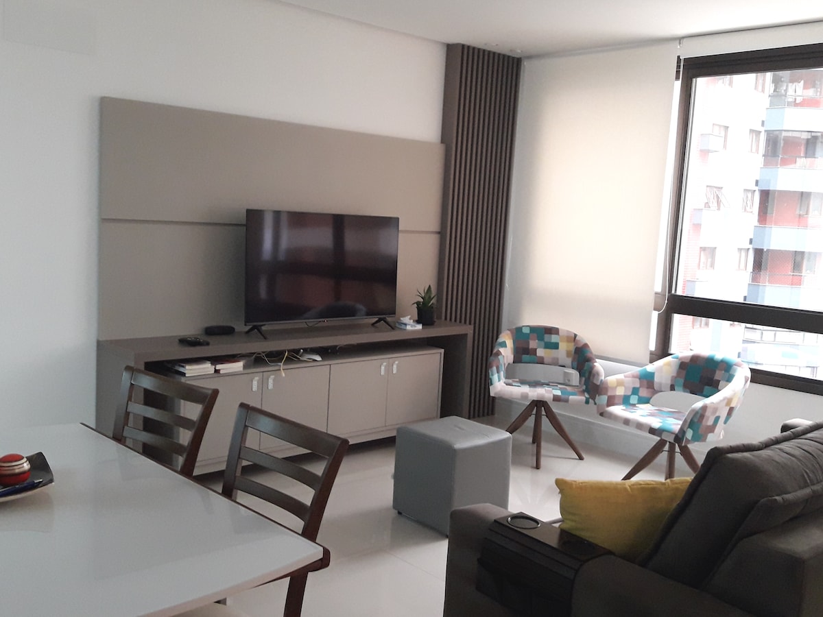 Apto completo com 1 dormitório, sofá cama + colchão de solteiro, próximo à praia (200m), restaurantes, lojas e cinema (Edifício Soul Flats). Prédio com área de lazer, piscina e academia no rooftop. Disponível também lavanderia coletiva (mediante autorização com custo extra). O apartamento está equipado com roupa de cama, mesa e banho, cadeiras e guarda-sol, churrasqueira, eletrodomésticos. 1 vaga de garagem disponível.