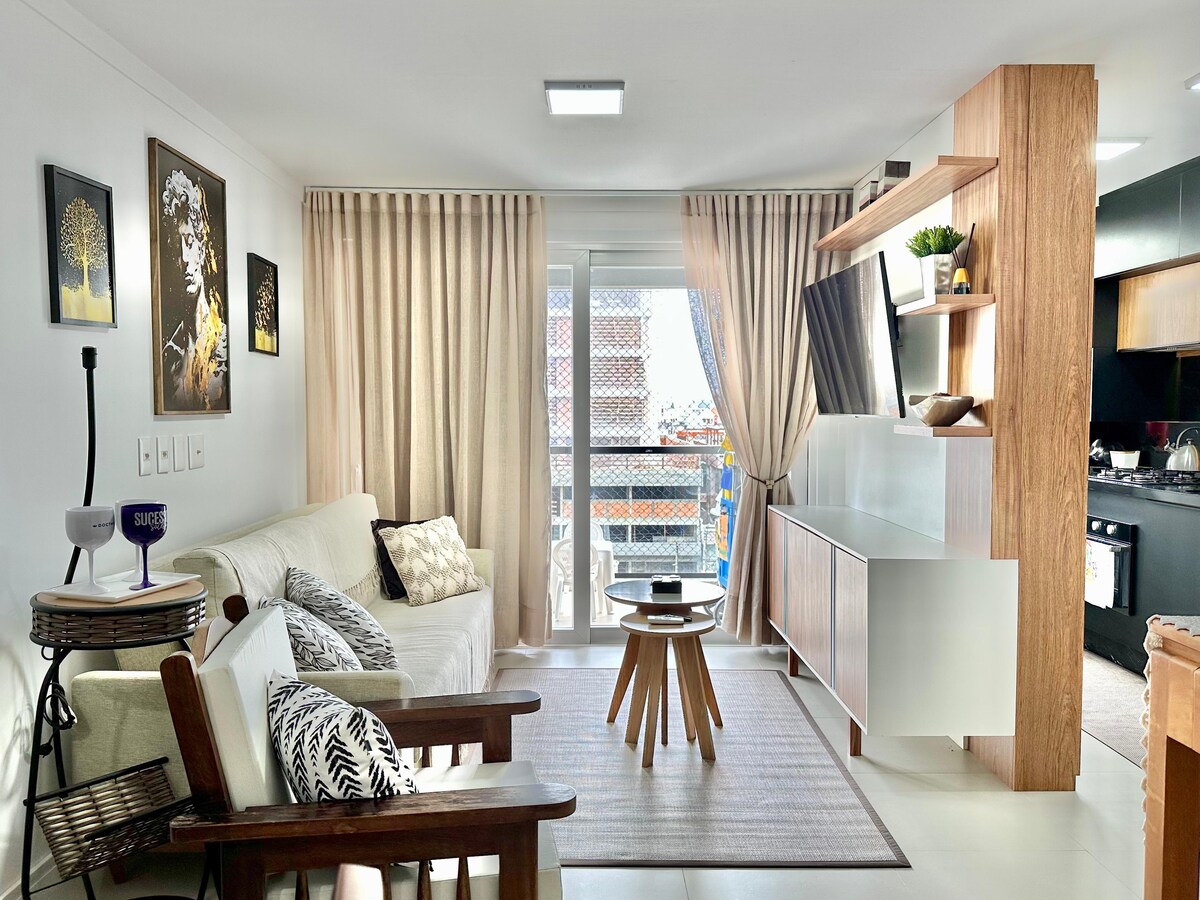 Complete apartment in the city center, close to markets, cinema, restaurants and shops. Less than 5 minutes from the sea! 😃 The apartment has a bedroom, living room, bathroom and kitchen/utility area, fully furnished and ready for use. In the living room, the apartment has a double-size sofa bed. Sea views from both the apartment and the terrace, which has a swimming pool, gym and leisure area. Also includes TV with Netflix and other streaming services (not included), barbecue and garage