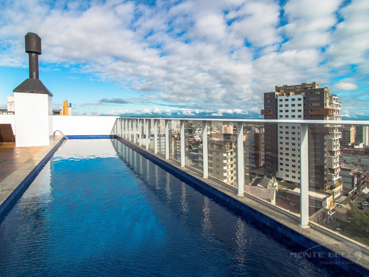 O flat possui diferenciais dos demais, localizado no ÚLTIMO ANDAR, acima dele (na cobertura) está todo o ROOFTOP (piscina aquecida, academia, terraço e salão de festa). Podendo acessá-los facilmente pelo elevador e/ou escada (ambos em FRENTE À PORTA do ap), pois é o próximo andar; e ainda possui uma BELA VISTA da cidade e uma parte do mar este à 200 mts.