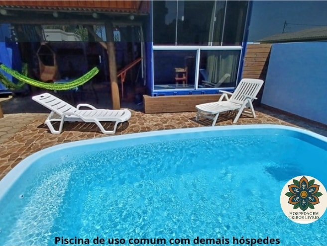Para até 10 pessoas (A PARTIR DE 16 ANOS). São 3 quartos com cama de casal (2 banheiros ao lado) e 1 kitnet (1 cama de casal + bicama). Na área comum temos piscina, cozinha coletiva, churrasqueira coberta, àrea de lazer com redes e poltronas, jardim acolhedor, tanque e varal. Oferecemos camas confortáveis e lençóis cheirosos, banho relaxante com ducha eletrônica.