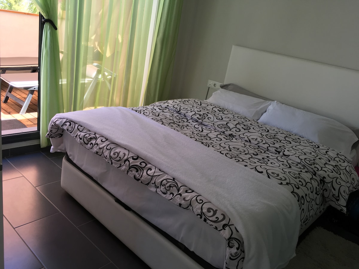 This luxury apartment in Villa is located in a quiet and a safety community with automatic gates and luxury flair with subtropical gardens, large swimming pool and a private inside or outdoor car parking area . The apartment has 2 bedrooms, the lounge/dining area, american kitchen and 2 full bathrooms (1 en suite). All rooms has air conditioner and are beautifully furnished.All outdoor terraces are private for own use. Also there is a heater for the outdoor terrace.
