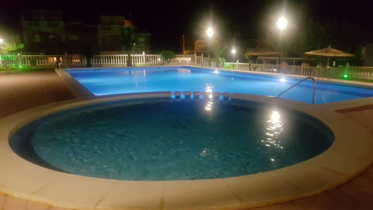 Beautiful urbanizacion with 2 lovely pools and well kept gardens.Two bedroom 1 bathroom and roof terrace bungalow in a very central location. Two Blue Flag Beaches 10 minutes walk away . The apt comes with WIFI and spanish norwegain swedish english tv chanels. Alicante and Murcia /Corvera Airport is 40 minutes away.