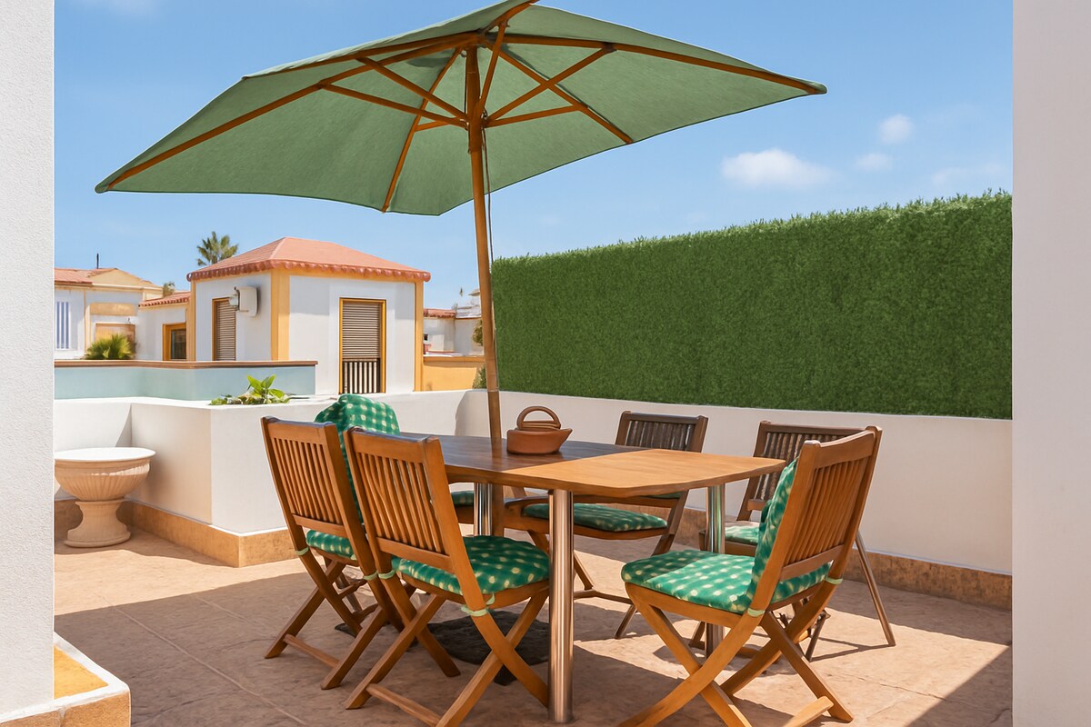 This private self-check-in bungalow near Villamartin Golf Course features 2 bedrooms and 1 bathroom, a fully equipped kitchen and a stunning rooftop solarium with a dining area and BBQ. The bungalow is newly renovated, including brand-new air conditioning, kitchen appliances, beds, mattresses and furniture. There is a private community pool (1 min walk), Villamartin Golf courses (2 min drive) and one of the biggest shopping center Zenia Boulevard for anything you need (5 min drive).