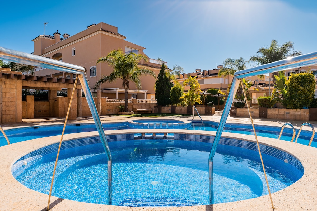 Détendez-vous dans ce logement luxueux et élégant. Composé de 2 chambres et de 2 salles de bains, cette appartement vous ravira par ses équipements et sa situation centrale. La résidence dispose d'une belle piscine commune arborée et d'un espace jacuzzi ainsi que d'une zone relax proposant un sauna, un hammam, 2 jacuzzis et une salle de sport. L'appartement se trouve à 5 minutes de plages, d'un grand centre commerciale (Zenia Boulevard) et à quelques minutes des plusieurs bars et restaurants.