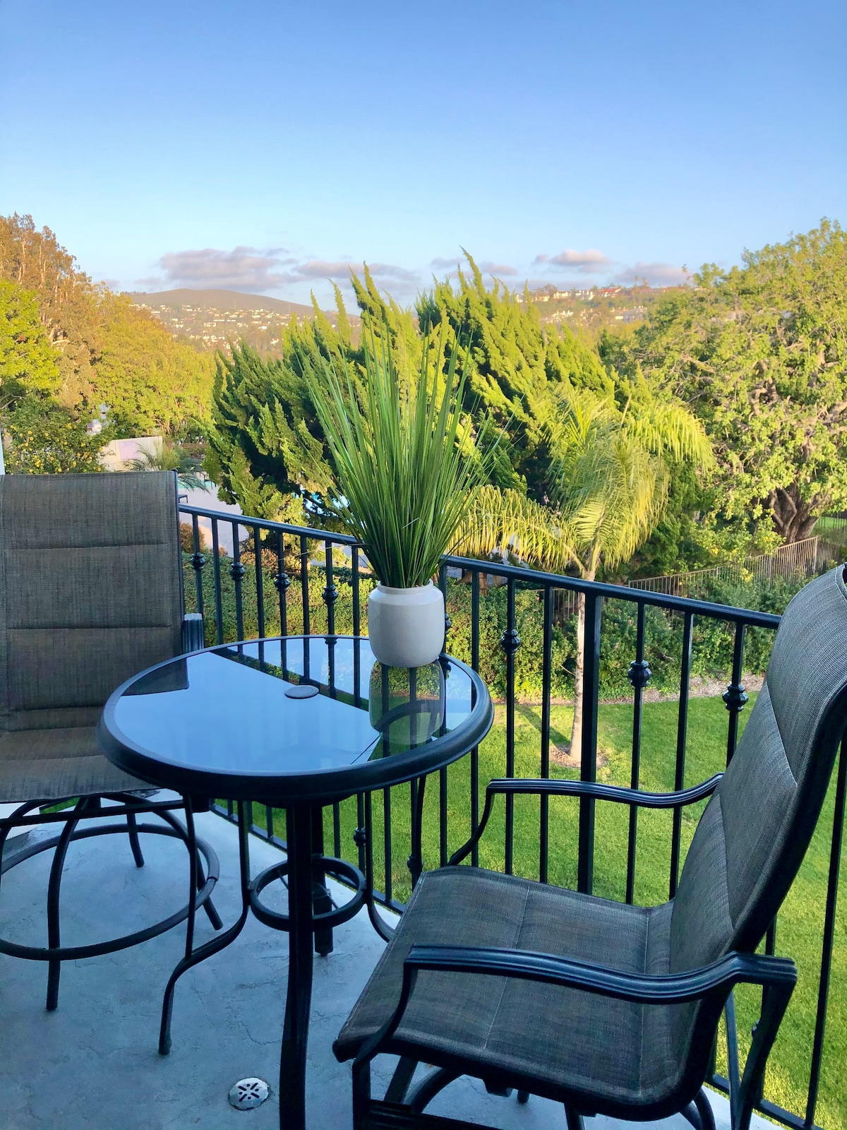 Escape to the serene Mango Guest Suite, your private garden-view oasis with its own guest entrance. Relax in a modern 310 sq ft space featuring a queen memory foam bed, loveseat, dining area, mini-kitchenette with a full-size refrigerator, in-room A/C & heating, and blackout curtains. Unwind in your dedicated patio area with two rocker chairs offering stunning views to the east. Enjoy free parking, easy access to Del Mar, Torrey Pines beaches/trails, UCSD, & quick connections to the I-5 highway.