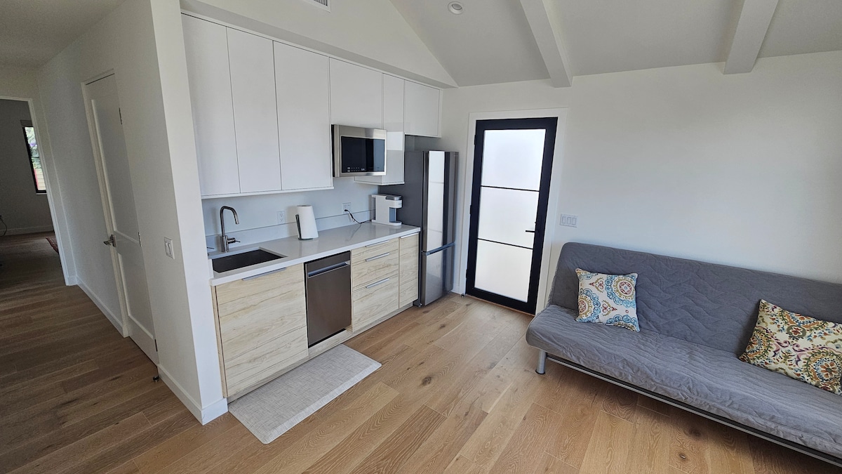 Artistically renovated, spacious studio loft with high end finishes and professional design by Solstice Interiors. Location can't be beat! Ocean view right out your window and short walking distance to Solana Beach's amazing Cedros Ave Design District and steps to Fletcher's Cove. Dedicated router within your space for your exclusive use and professional level customer service plan to address any ISP errors immediately. Perfect place to work remotely!