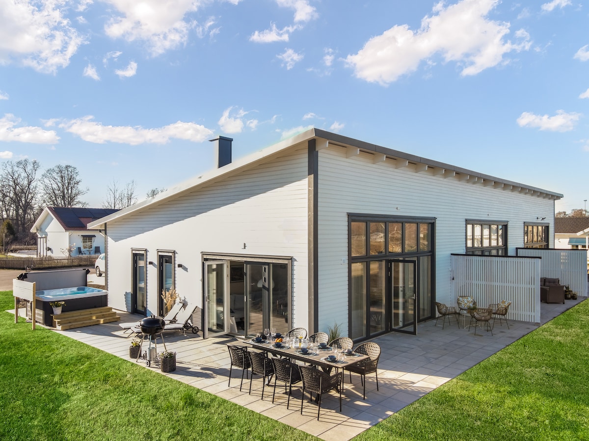 Välkommen till ett nybyggt & modernt arkitektritat hus direkt vid havet Rymliga ytor med 4m takhöjd i vardagsrum ger en luftig och lyxig känsla Fullt utrustat kök med diskmaskin Helkaklat badrum med tvättmaskin SmartTV, perfekt för streamingtjänster Dedikerad arbetsplats med höj/sänkbart skrivbord – perfekt för att kombinera arbete med semester 3 sovrum för familj eller vänner. Ta morgondopp, njut av solnedgångar och hyr jacuzzi, cyklar, handdukar och lakan för all-inclusive-känsla!