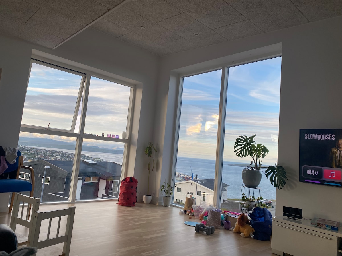 Large, peaceful apartment in the middle of the Faroe Islands. Geographically central. The longest distance by car is approximately 1 hour's drive. 6 of the islands are connected by tunnels and bridges. It is about 15 min to Tórshavn through the new underwater tunnel. Quiet village by the sea. Nice view from the livingroom. You will love my home because of the peace, the view and the surroundings.