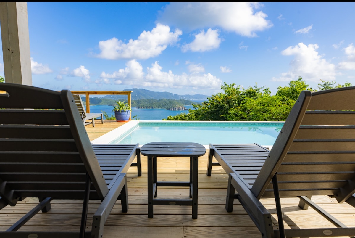 2 cozy bedrooms, fully equipped kitchen, large decks, pool, solar and backup battery power. Everything you need for a day at the beach: chairs, umbrella, coolers, toys, towels all provided. Close to Coral Bay restaurants and shops. North Shore beaches and hiking trails are only a short drive away. Quiet setting in the hills above Coral Bay. Close to it all with a far away feel. good for couples, solo adventurers, and families with children over the age of 8.