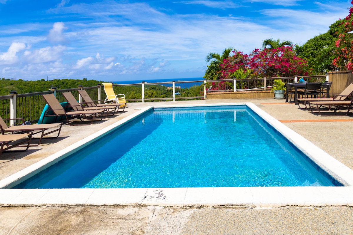 2 cozy bedrooms, fully equipped kitchen, large decks, pool, solar and backup battery power. Everything you need for a day at the beach: chairs, umbrella, coolers, toys, towels all provided. Close to Coral Bay restaurants and shops. North Shore beaches and hiking trails are only a short drive away. Quiet setting in the hills above Coral Bay. Close to it all with a far away feel. good for couples, solo adventurers, and families with children over the age of 8.
