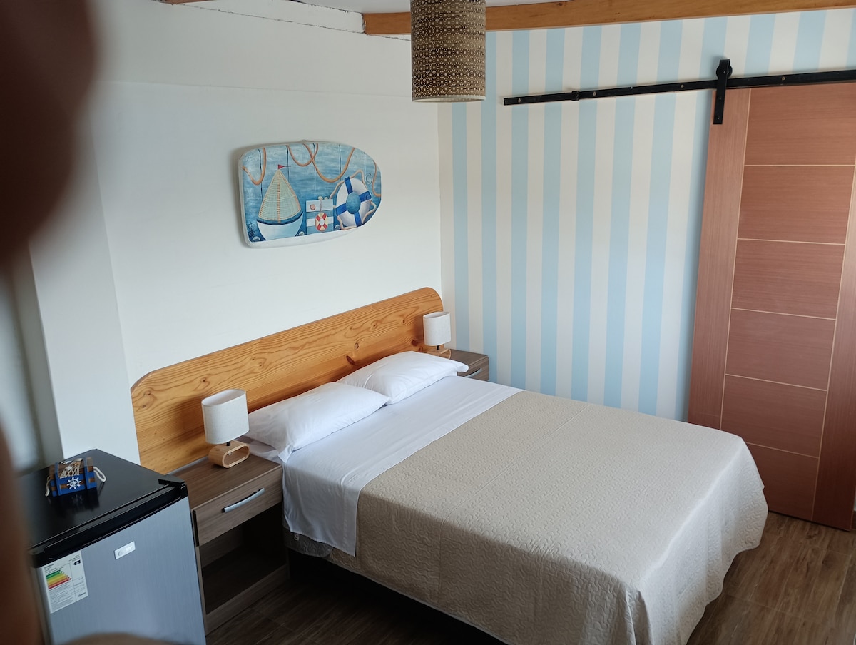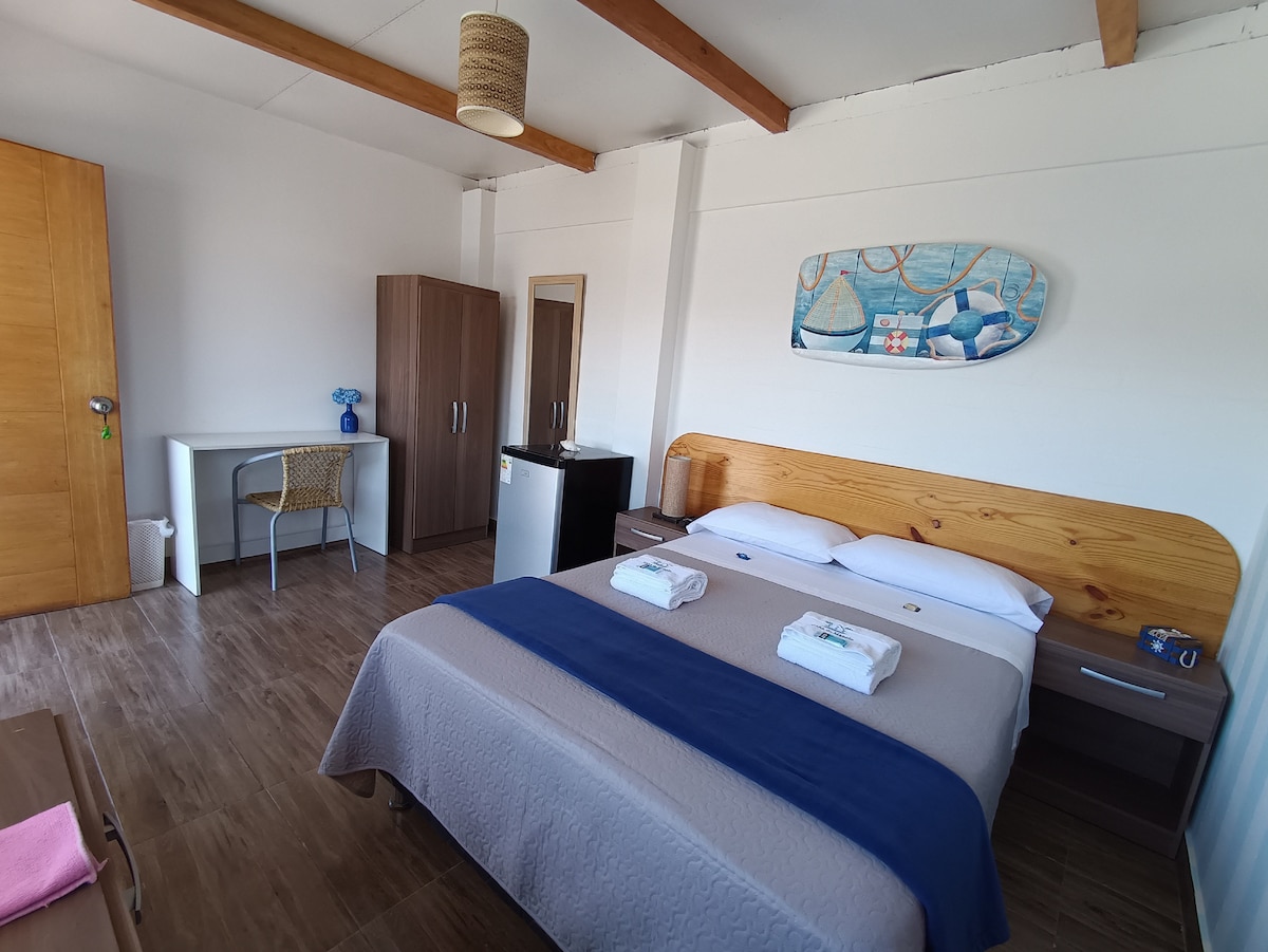 Habitac. Matrimonial 2do piso en Casa de Manolo-Balneario Tortugas, provincia de Casma, Región Ancash, Perú. Casa ubicada en 1ra fila c/hermosa vista al mar. Privilegiada ubicación en zona central, muy cerca de la playa, bodegas y otros negocios. Baño incorporado con agua caliente. Si quieres gozar del mar y días de relajo en contacto con la naturaleza, Tortugas es el lugar perfecto para disfrutar de paz y tranquilidad lejos del bullicio y estrés de la ciudad.