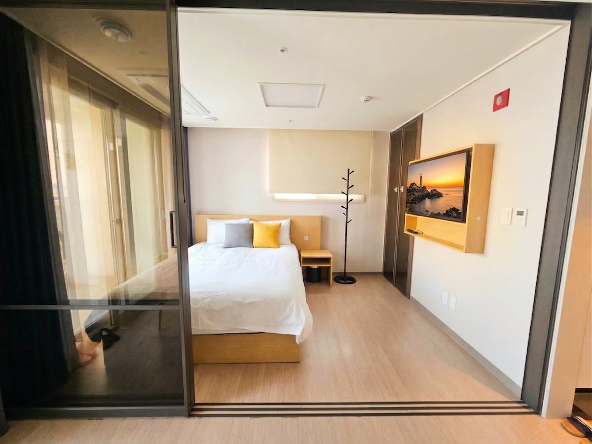 海景 [酒店 + 旅馆] 距离海滩 1 分钟 【连住20%折扣】 床上可欣赏海景 束草|中央市场 一周住宿折扣