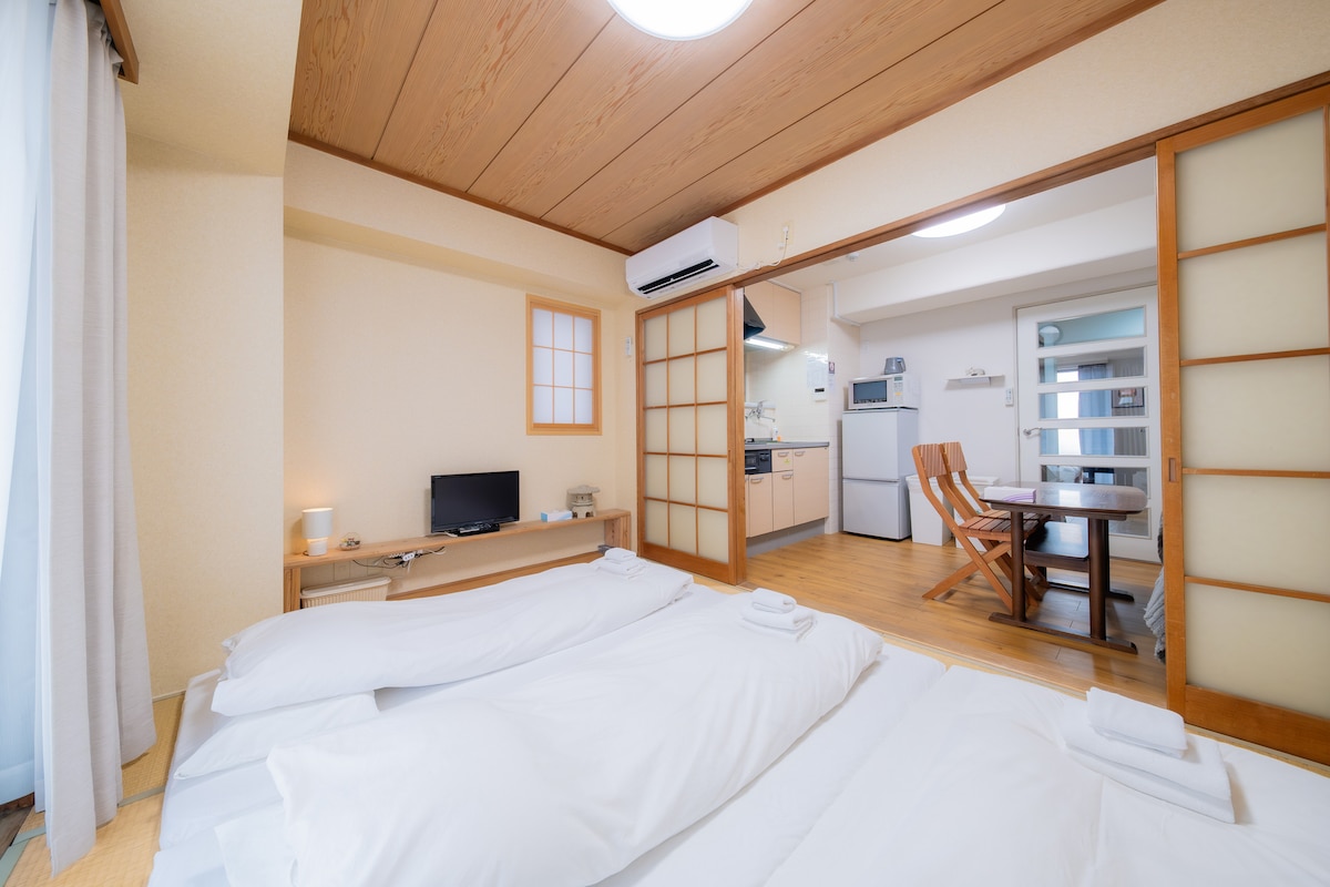 入住這間位處中心地段的房源,全家到哪都方便。 房內配置兩張加大雙人床,適合家人、朋友一同入住 床距舒適,動線保有獨立空間。最多可住5人 開放式廚房備有電磁爐、鍋具與碗盤,想吃家常菜、日式簡單料理都不是問題 吧台連接生活與用餐空間,不論是一杯早晨咖啡,還是一頓晚餐,一切都剛剛好。 洗手台與衛浴獨立設計,幾個人一起住也能保有自己的步調 提供藍芽音響,在日本的夜晚聽著音樂、泡個熱水澡是旅途中最放鬆的片刻。 房內備有投影機,可輕鬆連接常用的數位串流平台 洗衣機、空氣清淨機、熨斗與寬敞衣櫃一應俱全,你需要的,我們都準備好了 空間剛剛好,適合一個人靜靜地在吧台工作,也適合和朋友或家人一起住上幾天 自在相處,各自舒適。