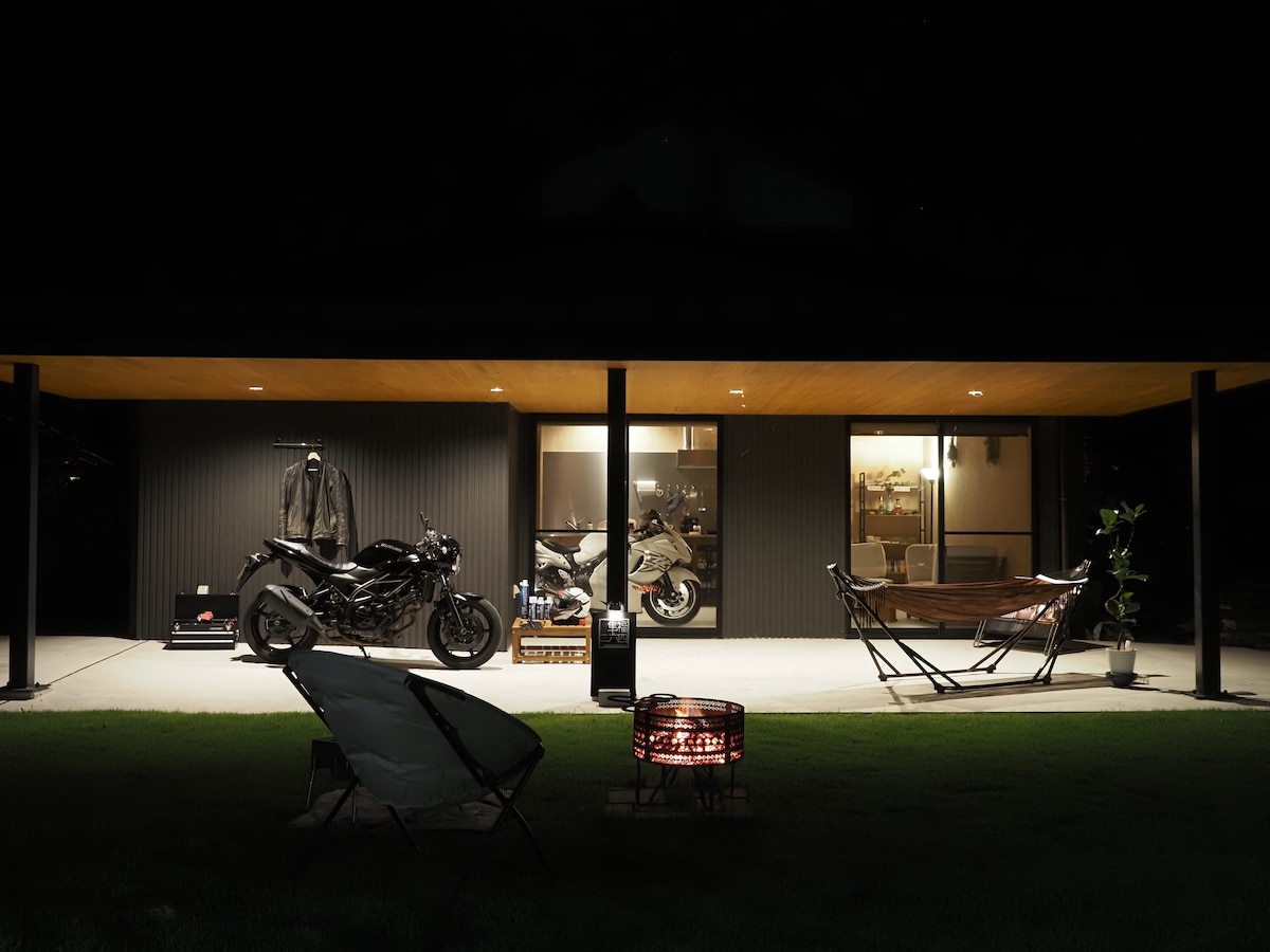 「泊まれるガレージハウス」がコンセプト。 愛車が家の中にある「リビングガレージのある生活」を体験できます。 「住んでいる」感覚を大切にした宿です。 「自分が家を建てるなら」を思い描きながら「モデルハウス」感覚でお過ごしいただくと楽しいと思います。 リフォームの話が聞きたい場合はお気軽に宿泊時にホストにお声掛けください。 土間コンクリートのリビング兼バイクガレージには薪ストーブとキッチンやソファがあり、機能はワンフロアに凝縮。どんなバイクにも相性の良いシンプルな内装に仕上げており、愛車のバイクと共にくつろぐことができます。 長く張り出した低めの軒下は吹込みが少なく、バイクの駐輪スペースやバーベキュースペースに。 フラットに室内と繋がった芝生の庭では水路の水音を聞きながら焚火や星空観望を。遠くで聞こえる若桜鉄道の音は郷愁を感じさせます。 静かな集落内にある静かな宿で大切な人、大切な愛車(車・バイク)とのゆっくりとした時間をお過ごしください。