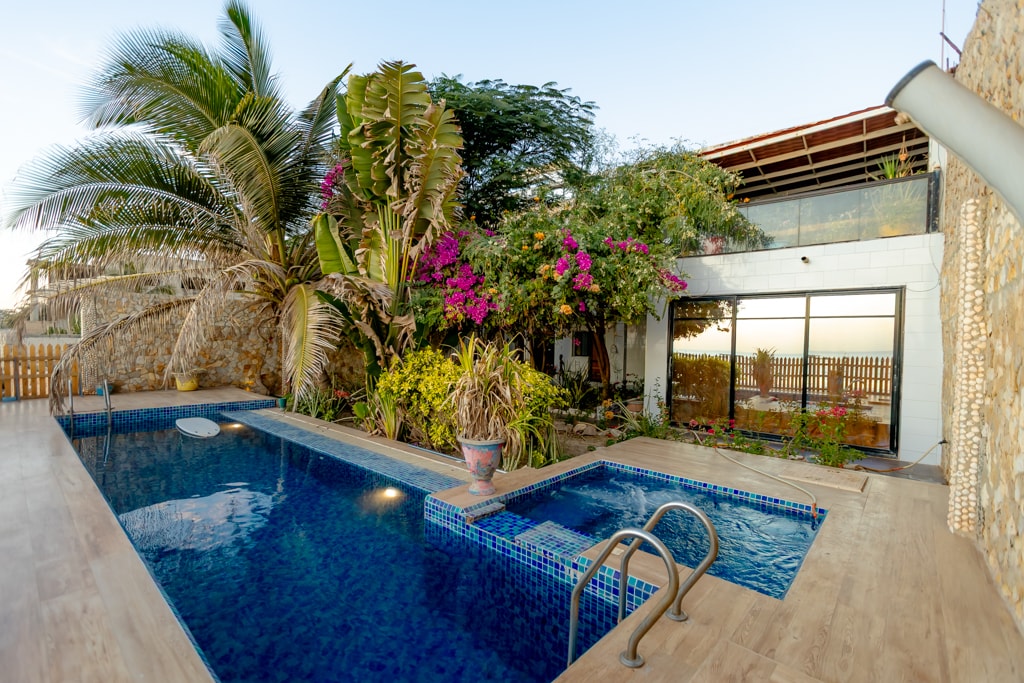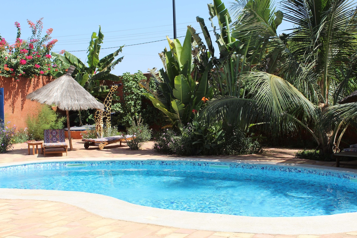 Ce logement élégant se situe à proximité des sites incontournables de la région : village artisanal, lagune de la Somone, Réserve de Bandia, parc exotique, Delta du Saloum… A 2 minutes à pied de la plus belle plage de Saly Obama Beach, il offre tout le confort moderne. Le studio se situe sur notre propriété, accès piscine, jacuzzi à température ambiante (accès privatisé pendant votre séjour) pool house avec cuisine, BBQ, transats et jardins.