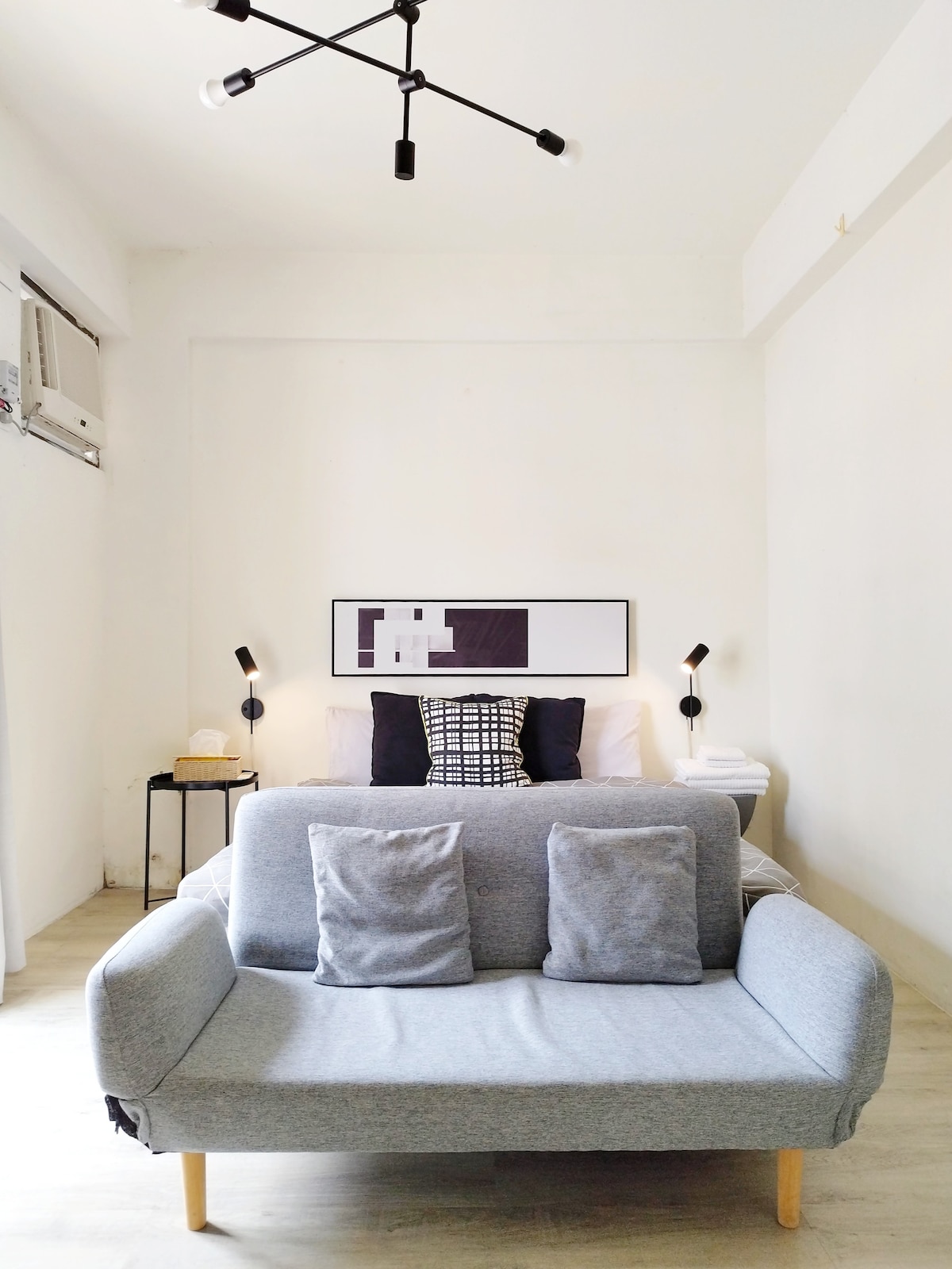 在這個設計時尚又安靜的空間中好好放鬆身心。 乾淨舒適有設計感的空間,可以讓您洗滌的一天出差或旅途的疲憊。 夜晚降臨,有恆溫型電熱水器,讓你洗個舒服的熱水澡,100%澳洲純小羊毛被,冬暖夏涼,蓋起來蓬鬆非常舒適,可以讓你一夜好眠。