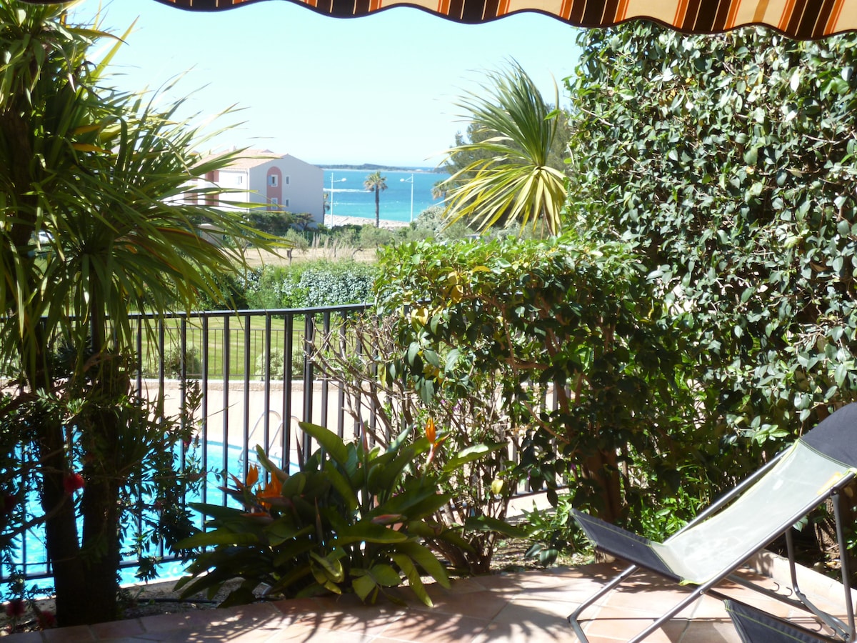 Petit appartement idéal pour 2 personnes, refait à neuf il possède une chambre, une terrasse agréable face à une jolie vue mer, la piscine est dans la résidence au pied de l’appartement. A 800 m de la mer et 5 min à pieds du port et du village, parking dans la résidence. Il est tout équipé avec un local à vélo. Je vous donnerais tout les bons plan pour profiter au mieux de notre petit paradis et des îles en face. Hésitez pas à regarder les commentaires positif reçus. A très bientôt