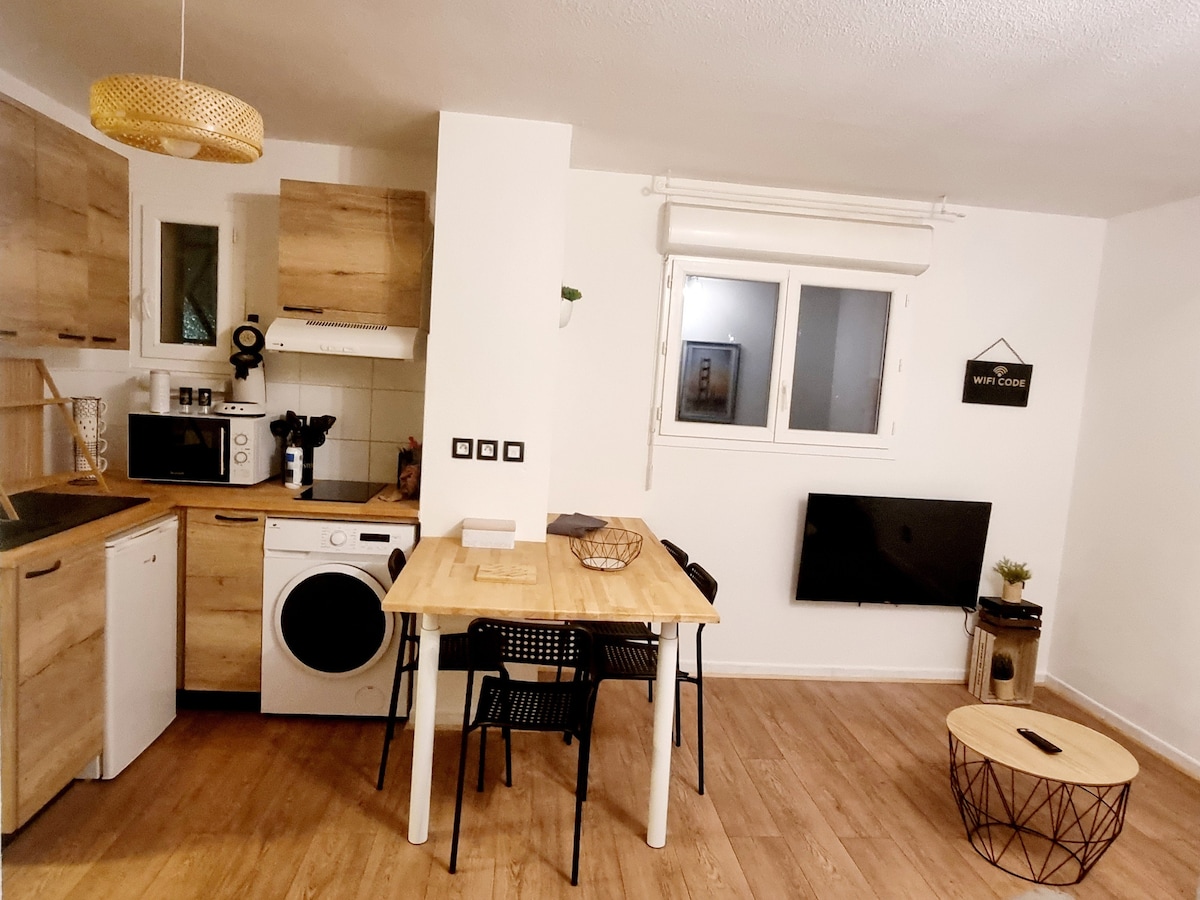 Modern 27 sqm studio on the ground floor of a quiet, secure residence in Colomiers, just minutes from Airbus and 20 min from Toulouse. Fully equipped kitchen, fiber Wi-Fi, Netflix, workspace, washer/dryer, linens provided. Private parking included. Self check-in via smart lock. Perfect for business trips or relaxing getaways.
