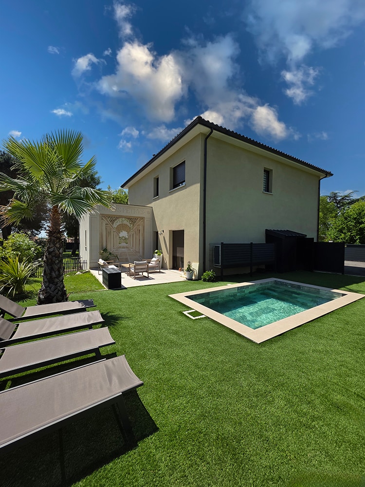 Beautiful house with pool & jacuzzi located north of Toulouse, with big deck made of exotic wood, dominating a private lake The house is surrounded with wide wooded garden (2000m2) A secured parking lot (100m2) is accessible for the guest The access is a private road, common with 3 other houses It is very quiet with no direct view on Neighbours Fabrice & Sophie will be happy to share their little paradise Optional (contact us) -Jacuzzi -Large extra suite -Weekend extension Arr. 2pm - Dep. 6pm