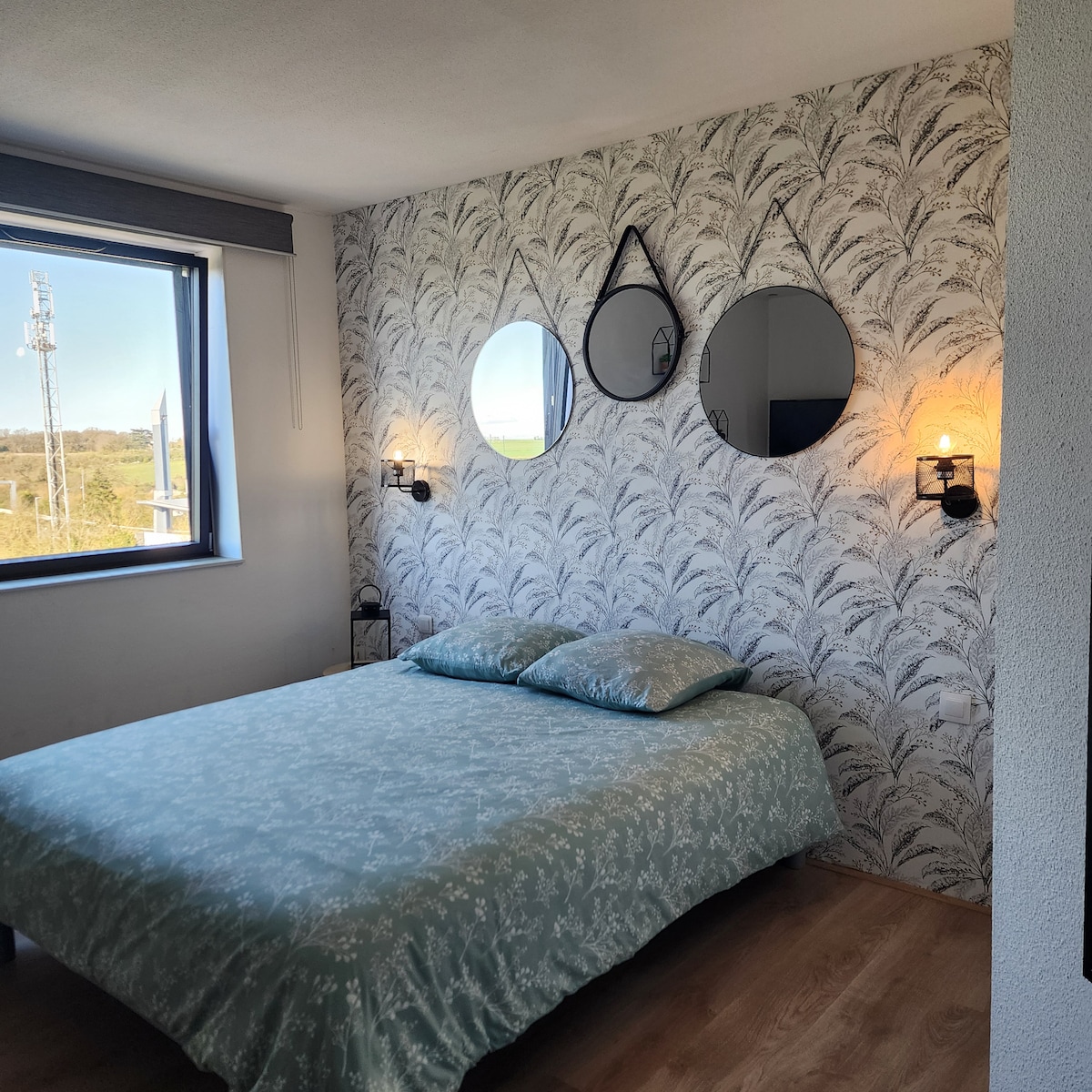 Logement refait à neuf spacieux et lumineux en sous sol de notre maison comprenant: - Une cuisine équipée avec four, micro-onde, plaque ,frigo, grille pain, cafetière, bouilloire, presse agrumes. Ainsi que tous les ustensiles necessaire. - Un salon avec un véritable canapé lit ( 140x 190 cm) et une télévision. Un authentique espace cocooning et chaleureux. - Une salle de bain avec douche et toilettes - Une chambre avec lit de 140x190 cm (matelas à mémoire de forme neuf ) avec télé et dressing.