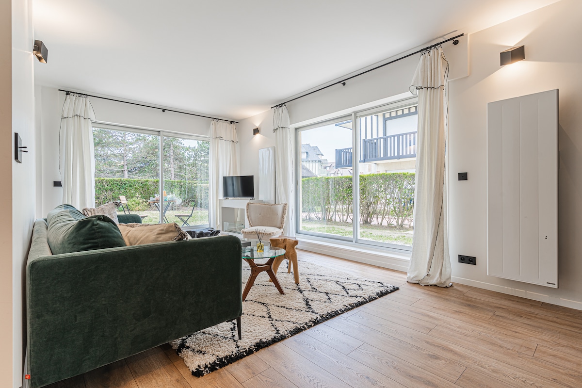 Grand studio avec grande terrasse sans vis-vis dans une résidence de standing, vue sur le jardin. Appartement entièrement rénové à 5 minutes à pied de la plage et des Planches, 10 minutes à pied de l'hyper centre de Deauville. Studio composée d'une large entrée, d'une grande pièce à vivre avec un lit armoire de très bonne facture (excellent couchage king size), cuisine séparée entièrement équipée, salle de bain en marbre avec baignoire. Calme, sérénité pour un séjour à seul ou à deux.
