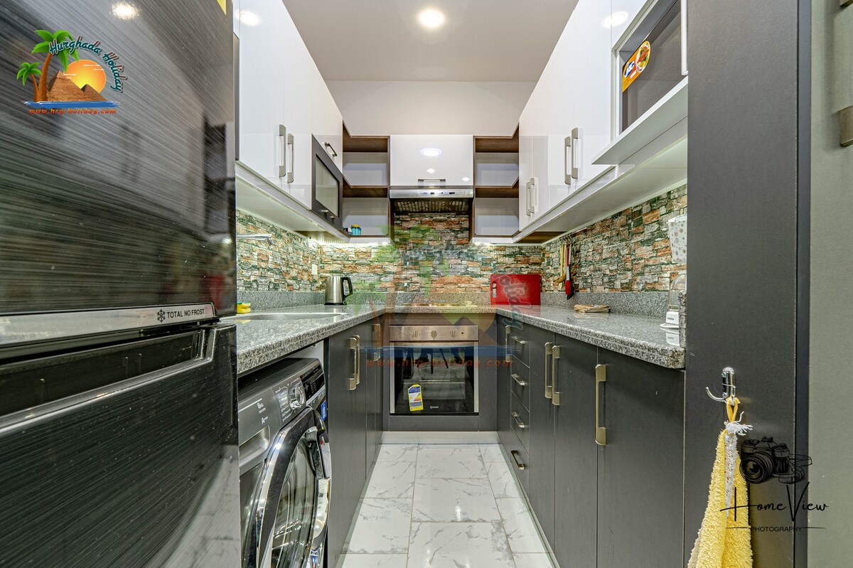Amazing apartment in the heart of Hurghada! Our place will make you feel as if you are at home and offer you endless peace of mind with its panoramic view. With this prime location, you will be able to roam around downtown Hurghada by foot. It has an artistic feel with shades of blue that reflect the amazing view. With access to a private beach and a private pool guests can simply enjoy their stay without even leaving the compound.