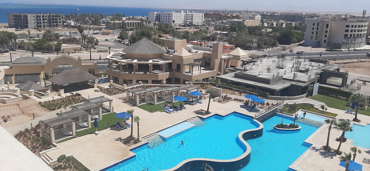 Fully furnished 2 bedroom apartment with 2 balconies with views over the pool. Gym on site . The apartment is supplied with everything for longer stays, full kitchen, hob, washing machine, air fryer, microwave. Air conditioning in every room. Smart TV, Vodafone pay as you go WiFi so you can work from home. 2 value for money Restaurants with great food, also on site shop, hot tubs are all available on request , all 5 minutes away from beautiful El Gouna, only 20 mins from airport.