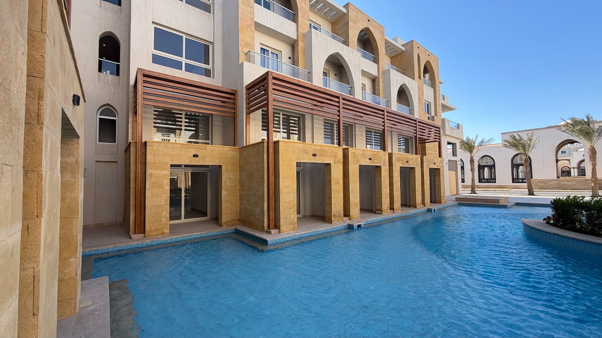 Relax Stays | Luxury 85sqm Serviced Apartment @ Fanadir Bay Experience the perfect blend of space and comfort in our oversized 85-meter serviced apartment. Located in the prestigious Fanadir Bay Resort on El Gouna Road, this unit offers a stunning side view of the Red Sea and the sparkling pool from your private balcony or garden.