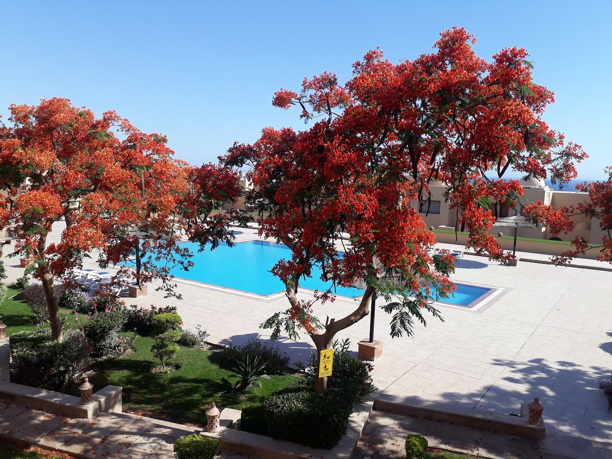 Amazing 1 bedroom apartment pool & sea views in the best place (The View Residence) in the heart of Hurghada in Old Sheraton street. Enjoy 3 pools and private beach. 1 double bed in a room and 2 bed sofas in the living room, suitable for 2 adults + 2 children or 3 adults. washing machine-2 air-conditioners- Tv-Wifi-calm and clean-high privacy and securit-perfect place for vacation. Close to all:- cafes,supermarkets,bazaars,Hurghada Marine. You can go on foot anywhere you want.
