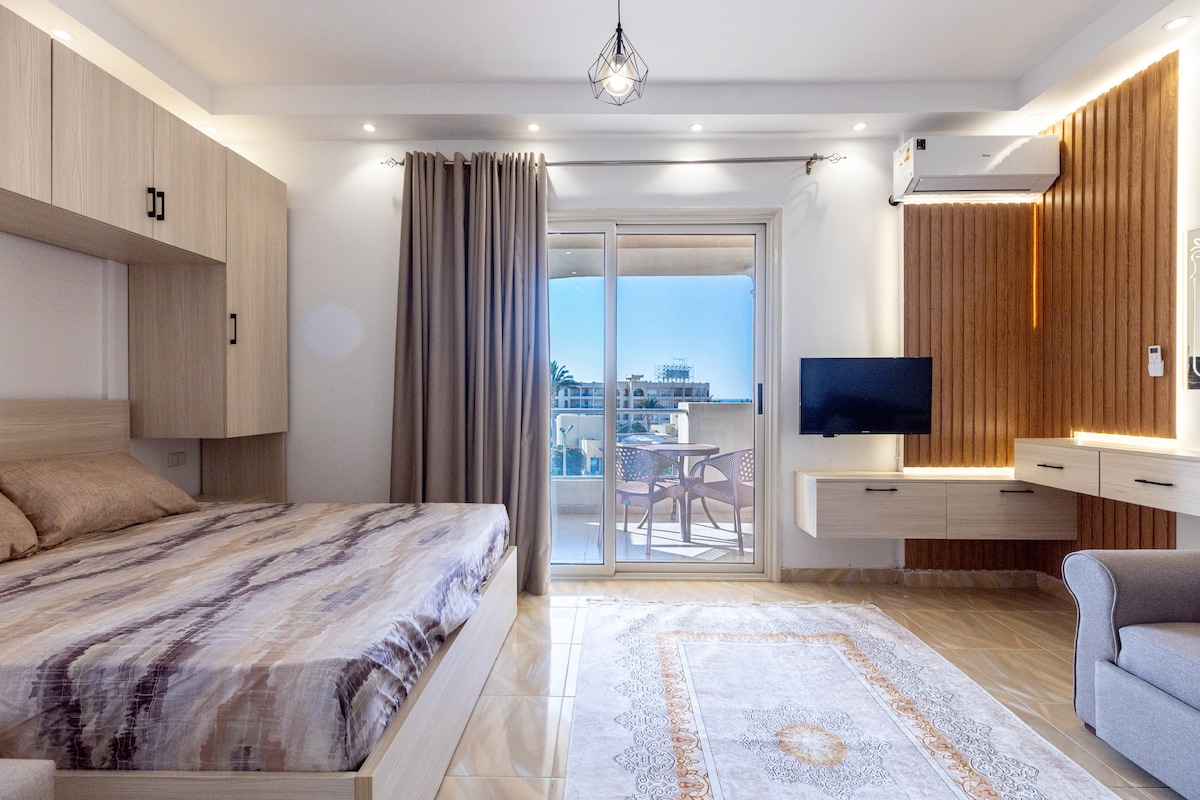 Relax in our cozy sea-view studio in central Hurghada, right by the Red Sea. Perfect for couples, solo travelers, or small families looking for comfort, great location, and resort vibes near the city center. What You'll Like: Free private beach and swimming pool access Red Sea and pool views from your private balcony Prime location on Old Sheraton Street – close to cafes, shops, nightlife & supermarkets Free Wi-Fi, 24/7 security & on-site parking Complimentary shuttle bus within the resort